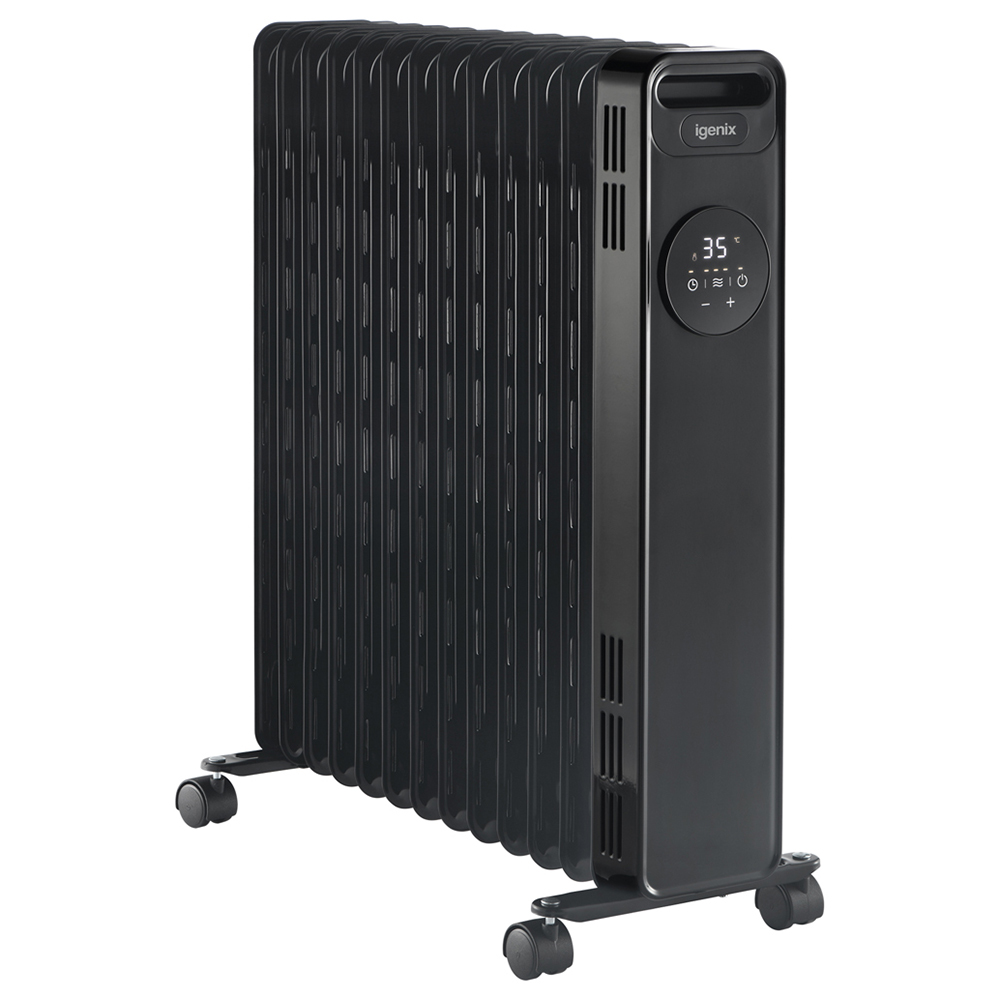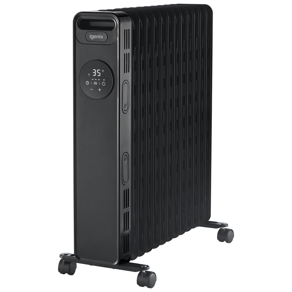 The Igenix Black Digital Oil Filled Radiator offers a stylish and efficient way to heat your home. This 2500W radiator provides portable warmth, a welcome alternative to central heating, quickly warming your room. Its digital LED control panel and included remote allow for easy temperature adjustment across three heat settings. Conveniently equipped with rolling castors, it moves effortlessly from room to room. Safety features include overheat protection and an automatic tip-over switch, ensuring peace of mind.