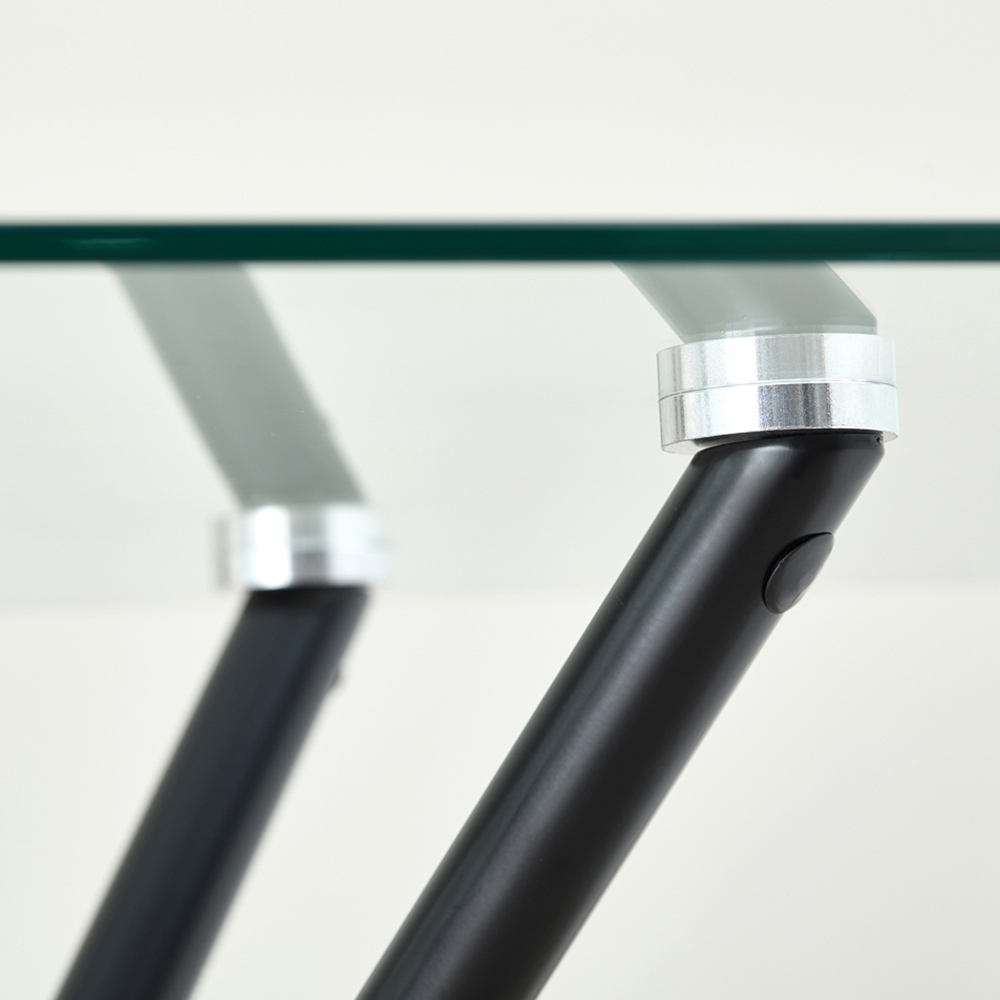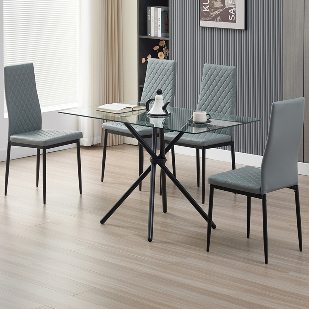 Elevate your dining area with the Emily 4-seater leather dining set in grey. This stylish ensemble features a modern Miami dining table with a chic glass top, complemented by four comfortable leather chairs. Perfect for intimate family dinners or stylish gatherings, this set seamlessly blends comfort and contemporary design to enhance your home's aesthetic.