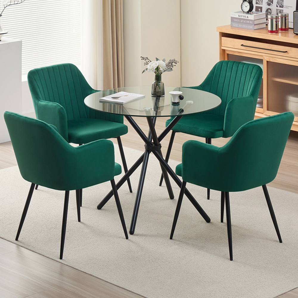 Elevate your dining experience with the Indoor Living New York 4-seater dining set. A round glass tabletop sits atop a uniquely designed, sturdy matte black metal base. Four plush Charlotte green velvet chairs, each with curved armrests, sleek stitching, and sturdy matte black metal legs, complete the ensemble. This luxurious set seamlessly blends contemporary style and comfort, ideal for intimate gatherings or family dinners, adding a touch of modern elegance to your home.