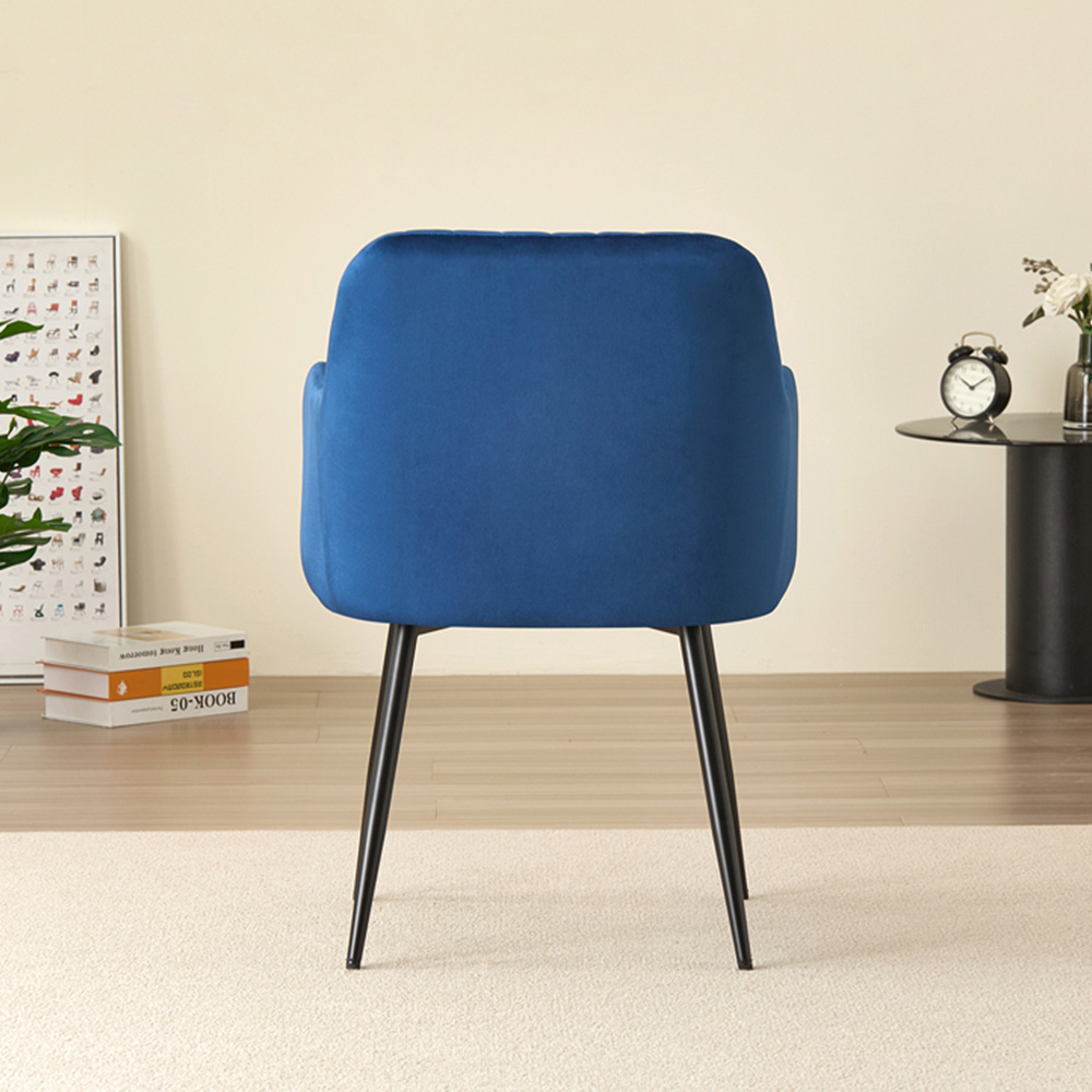Elevate your dining room with the Seattle dining set. This chic ensemble features a round marble table with a uniquely designed matte black metal base. Four plush Charlotte chairs, upholstered in luxurious blue velvet, complete the look. The chairs' curved armrests and subtly stitched details add a touch of sophistication, while their matte black metal legs maintain the set's modern aesthetic. This four-seater dining set offers comfort and contemporary glamour for years to come, perfect for hosting unforgettable dinners.