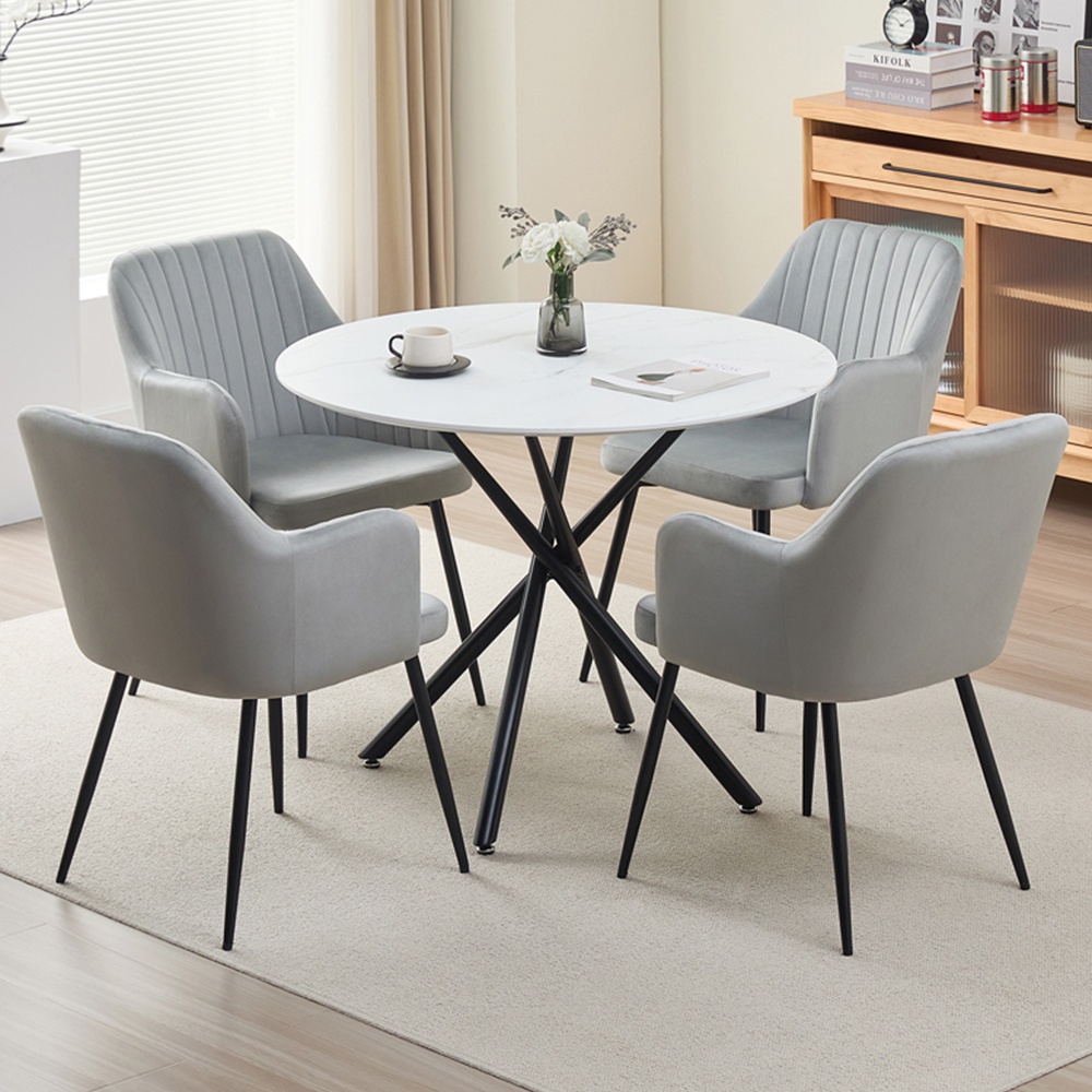 Elevate your dining area with the Seattle 4-seater round dining table and Charlotte grey velvet chair set. This contemporary design features a stunning marble tabletop supported by a uniquely designed, matte black metal base. Four plush Charlotte chairs, upholstered in high-quality grey velvet, complete the ensemble. Their curved armrests and sleek stitched lines offer both comfort and style, complemented by sturdy matte black metal legs. Perfect for intimate family dinners or stylish gatherings, this set effortlessly blends luxury and modern appeal.