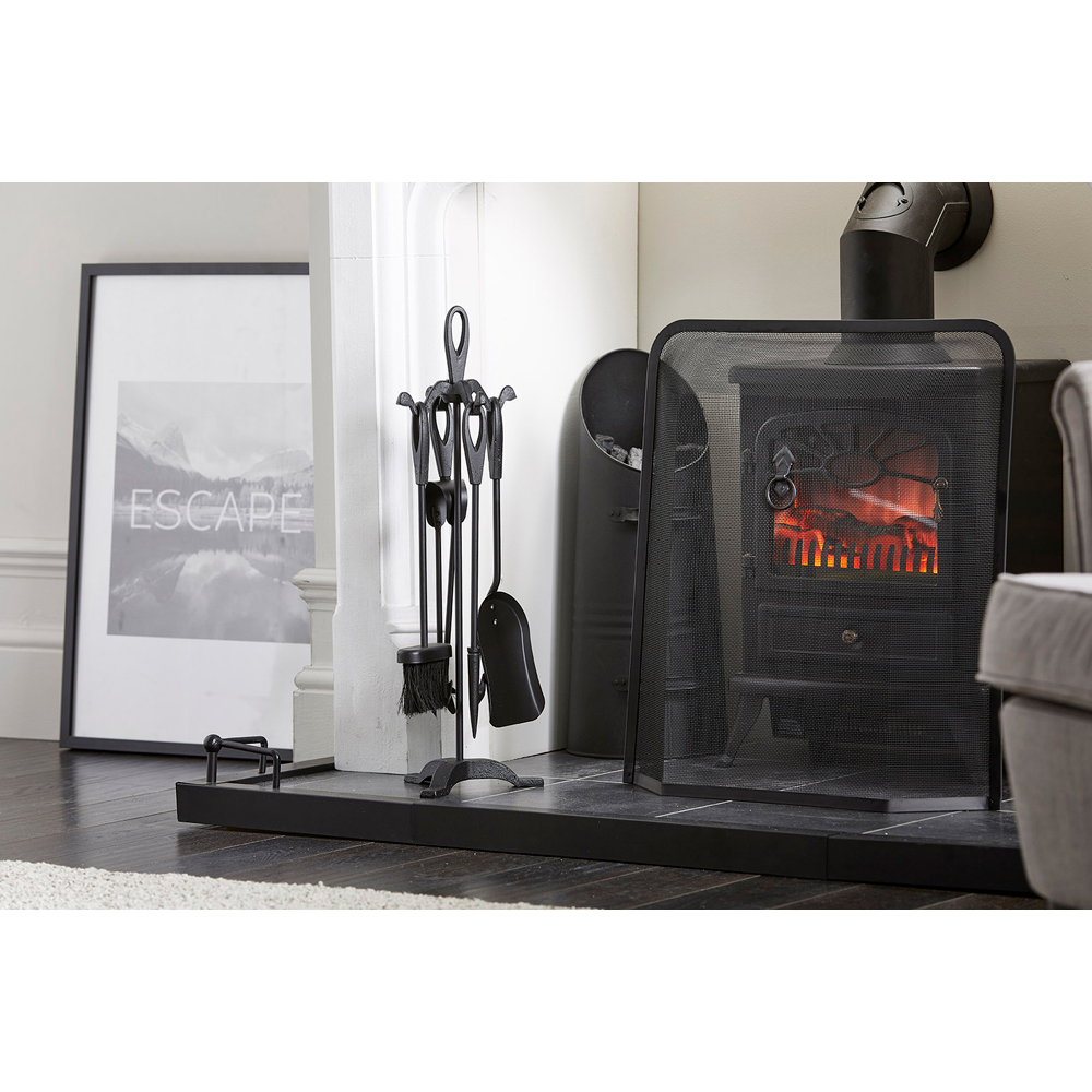 Elevate your fireside with this five-piece Inglenook fireplace tool set – a must-have for any hearth. Crafted from durable black cast iron, this set boasts a modern design with sleek loop handles for comfortable and safe use. The set includes a hearth brush, shovel, poker, and tongs, all neatly organised on a convenient storage stand, keeping your fireside tools readily accessible. Complete your fireside collection today.
