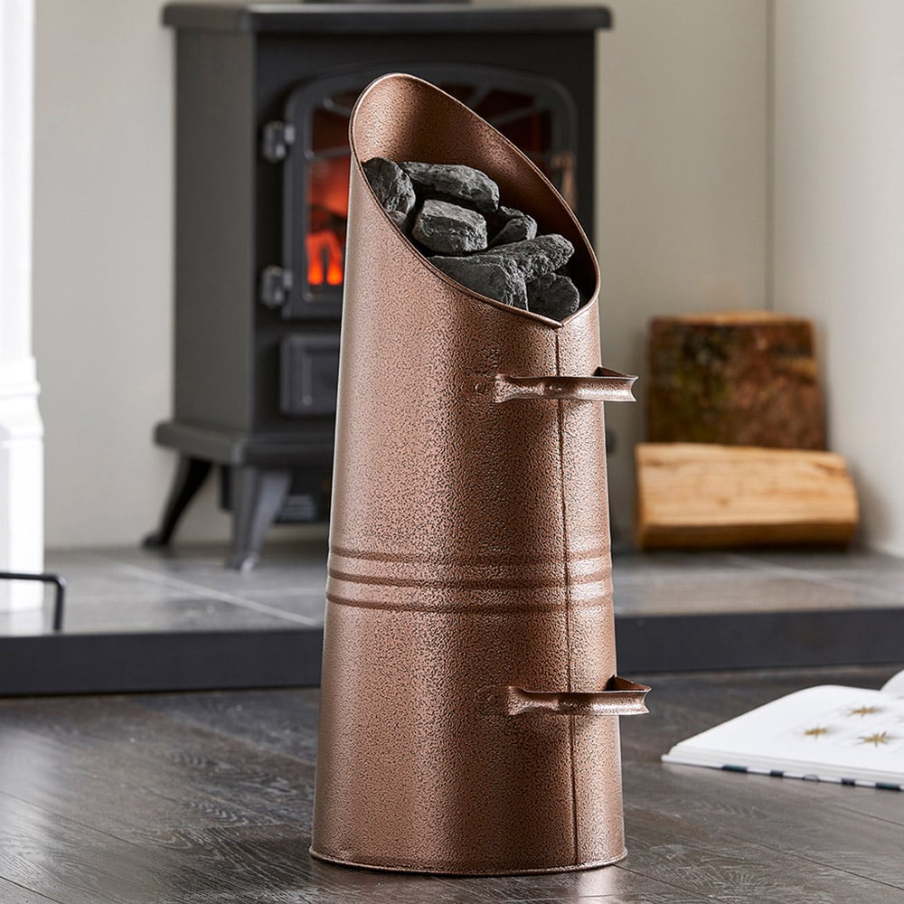 The Inglenook Fireside Traditional Copper Coal Hod is a practical and stylish addition to any hearth. It',s designed for easy storage and transport of coal, logs, or kindling, keeping your fireplace area tidy and enhancing its traditional charm. The generous interior offers ample space for fuel, while the wide opening makes loading a breeze. Its compact dimensions ensure it fits comfortably in even smaller spaces, and the twin handles provide a secure and comfortable grip for effortless moving. Measuring 24cm wide at the base and 57cm tall, this coal hod offers both functionality and classic appeal.