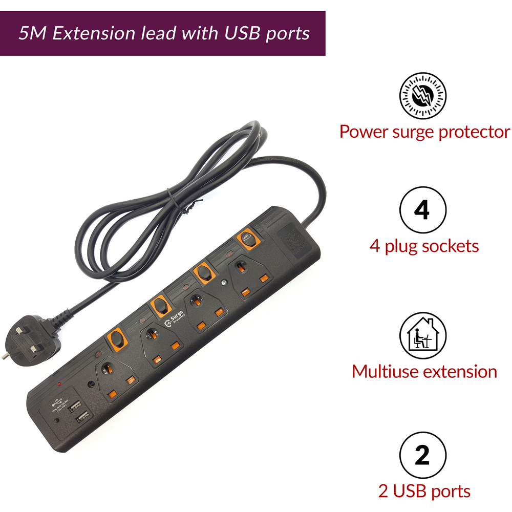 This versatile 4-way extension lead is designed to tackle the challenge of insufficient power sockets when you have multiple devices to charge or power. Featuring a generous 5-metre cable and a robust 13A rating at 240 V, it seamlessly fits into both home and office environments. With individual switches for each socket, you can easily control power to your devices, while the dual USB ports provide a total output of 3.1 A for convenient charging of smartphones and tablets. Equipped with a neon indicator and surge protection, this extension lead ensures both safety and functionality, making it an essential addition to your power solutions.