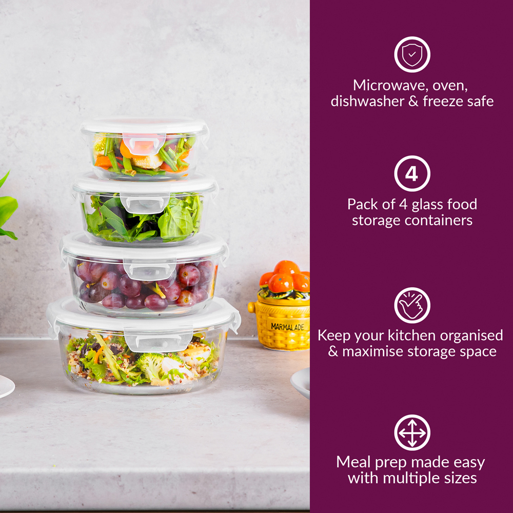 This Innoteck Essentials glass food storage set features four containers in varying sizes, perfect for all your kitchen storage needs. Crafted for durability, these hard-wearing glass tubs are oven, microwave, freezer, and dishwasher safe. Their rectangular shape allows for easy stacking, ensuring a neat and tidy fridge, freezer, or pantry. Ideal for picnics and meal prepping, these premium glass containers boast air-seal, leakproof lids, making daily dinner preparation a breeze. This versatile four-pack is your go-to solution for food prep, office lunches, ready meals, portion control, and more.