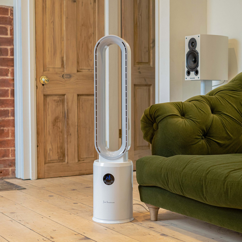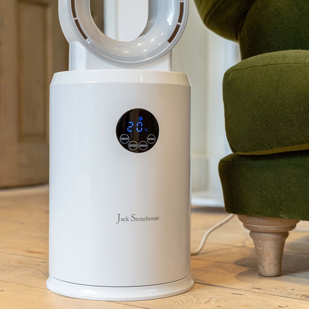 Enjoy the perfect indoor climate with the Jack Stonehouse Grey Bladeless Fan with LED Lights! This bladeless fan heater banishes stuffy days and chilly evenings, providing warmth or a refreshing breeze at the touch of a button. Control is effortless with the smart infrared remote and LED touch button display, allowing you to easily select between cooling fan, low heat, and high heat settings. Multiple safety features, including overheat and tip-over protection, ensure peace of mind. Added features include a detachable filter net, night light option, and oscillating swing. A one-year warranty is included. 220-240V, 1300-2000W.