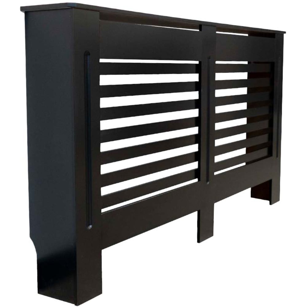 Transform your living space with this stylish matt black radiator cover. Its sleek horizontal lines and sophisticated finish discreetly conceal unsightly radiators, instantly upgrading your room',s aesthetic. This elegant cabinet allows for even heat distribution, ensuring your room remains comfortably warm. The convenient top shelf offers a perfect display area for cherished ornaments and photographs. Simple self-assembly is guaranteed with clear instructions and all necessary fittings included, allowing for a flush wall mount for extra stability. The cover arrives flat-packed for easy delivery and installation. The cover features chamfered edges.