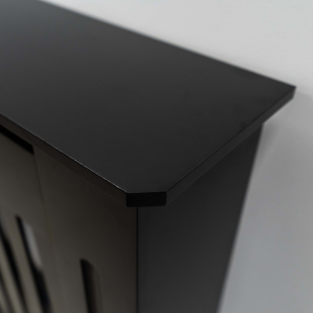 Elevate your home's style with this elegant black radiator cover. Its modern vertical grill design and smart chamfered edges seamlessly complement any décor, discreetly concealing less-than-attractive radiators while maintaining efficient heat distribution. Crafted from durable MDF, this stylish cover offers ample display space for cherished plants, ornaments, or photos. Easy to assemble with all necessary fittings included, it mounts invisibly to the wall for a clean, polished look. A budget-friendly choice that doesn't compromise on quality, this cover provides a stunning upgrade for your space. Size: Small.