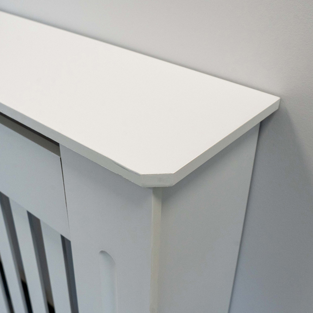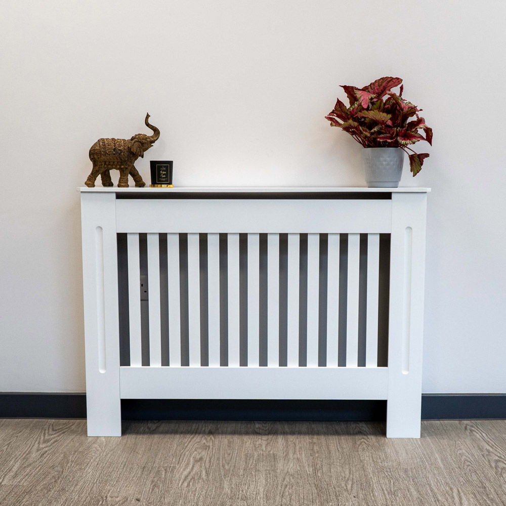 Elevate your living space with this stunning radiator cover. Its clean, white finish and modern vertical grill complement any décor, seamlessly concealing tired or old-fashioned radiators. The cleverly designed cover ensures efficient heat distribution, while the generous top surface provides ample space for cherished plants, photos, or ornaments. Crafted from durable MDF for lasting quality, this easy-to-assemble cover features chamfered edges and includes all necessary fittings for discreet wall mounting. A stylish and affordable solution for a refreshed interior. Size: Medium.