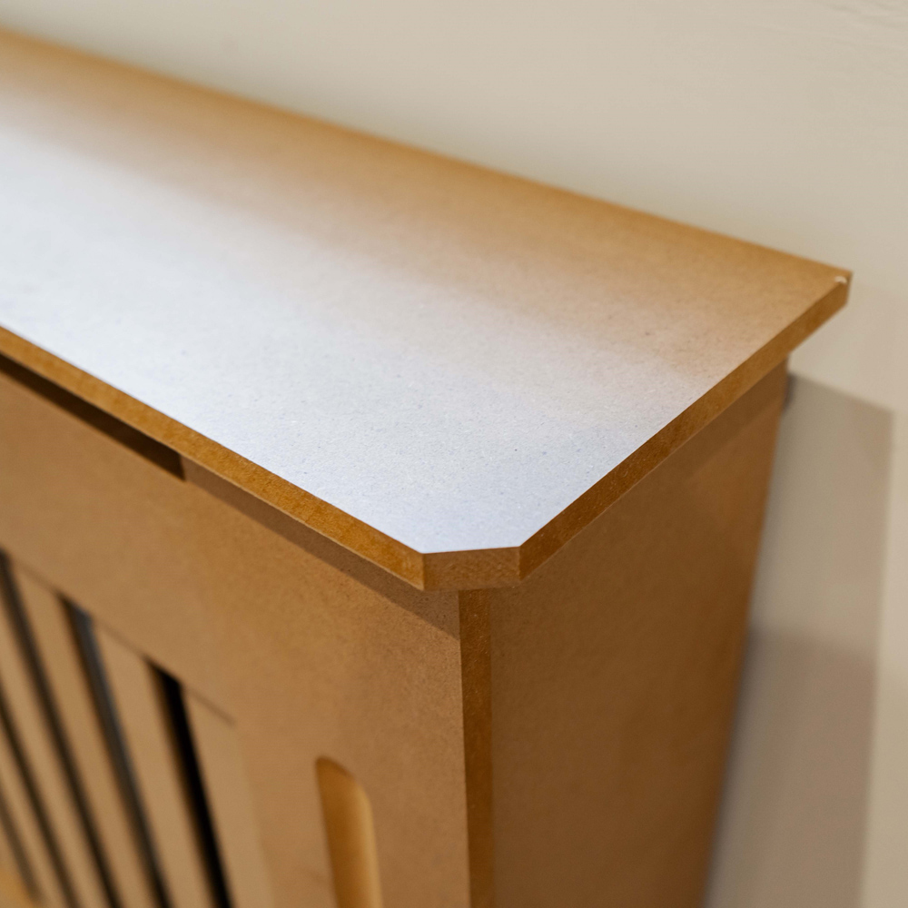 Elevate your living space with this unfinished vertical radiator cover. A stylish and practical solution, this elegant unit is ready for you to paint, allowing you to create a truly bespoke piece that complements your home',s unique style. Discreetly concealing unsightly radiators while ensuring efficient heat distribution, this cover offers both functionality and aesthetic appeal. Save money by concealing, rather than replacing, your existing radiator, transforming your room with a touch of sophistication. The cover also provides valuable extra surface area, perfect for displaying cherished ornaments and personal belongings. Its contemporary design seamlessly integrates into various interior styles, making it a stunning focal point. Simple to assemble, this durable MDF cover includes all necessary fittings for a smooth, invisible wall mount. Available in a Large size.