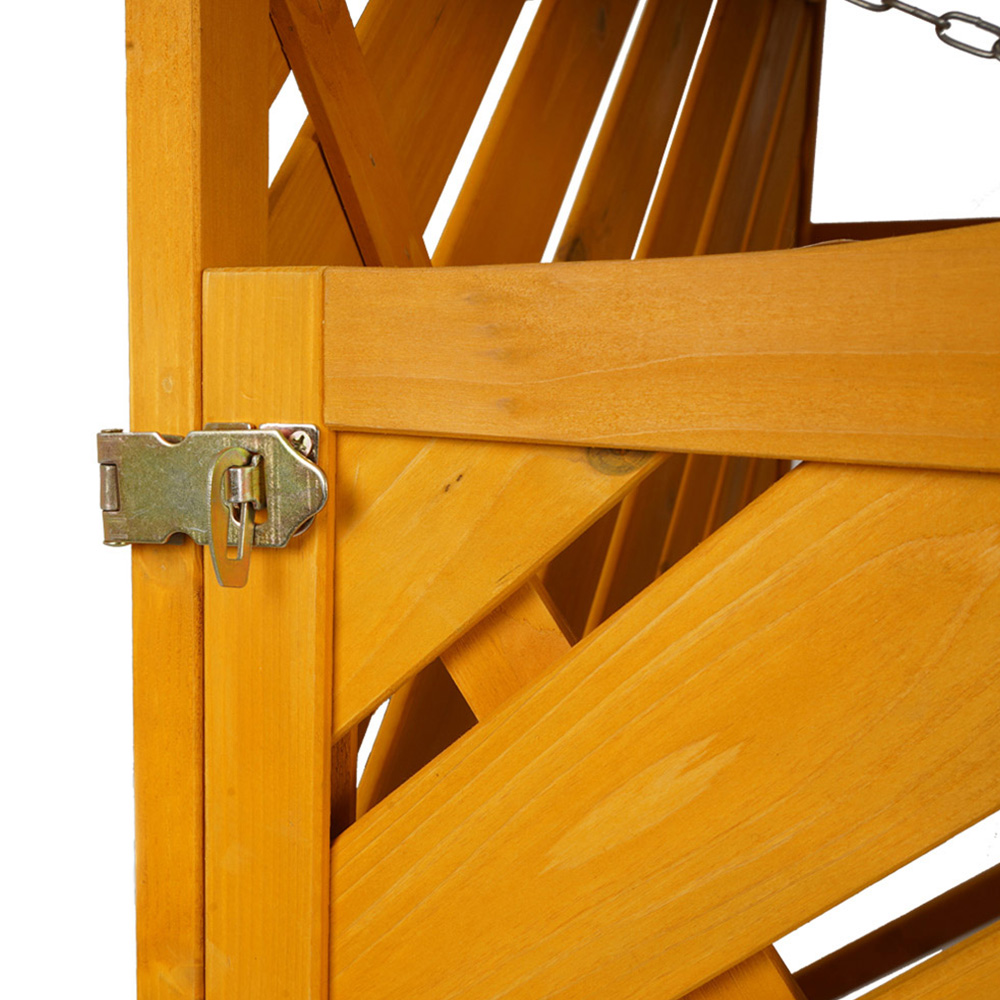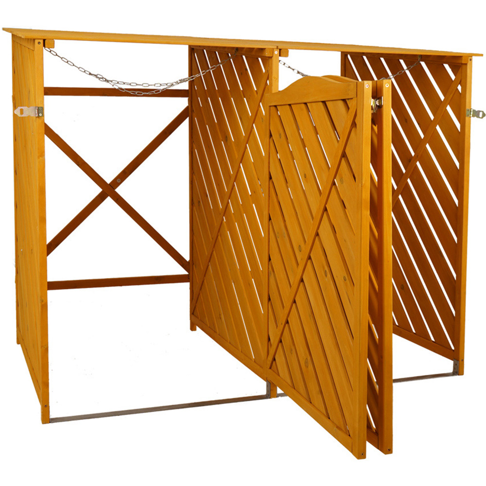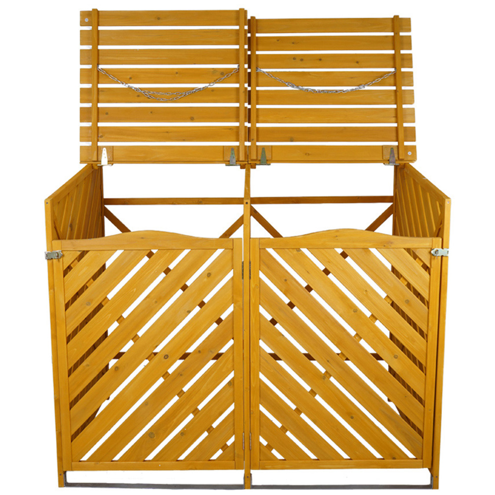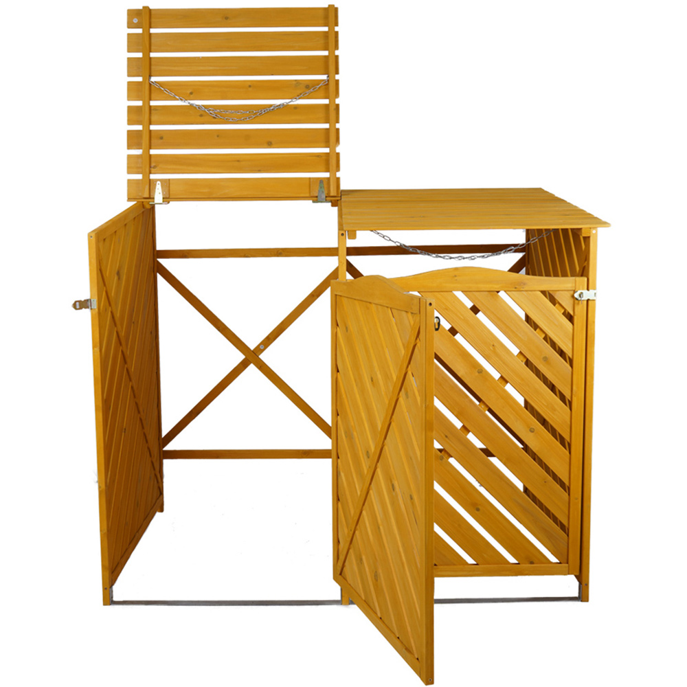 Stylishly conceal two wheelie bins with the Natural Wooden Double Wheelie Bin Storage. This slatted wood storage unit offers a discreet solution for your garden or front yard, featuring lockable front doors for convenient bin access on collection day. Built-in ventilation prevents unpleasant odours, while a central divider allows for extra storage in the unused space. A convenient liftable top provides easy access to bin contents without removing the bins themselves. Complete with all necessary fittings and assembly instructions for a straightforward setup.