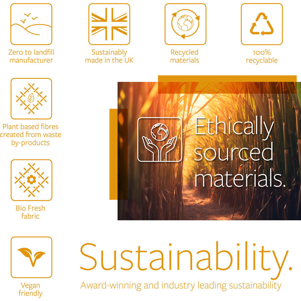 Experience the refreshing sleep of the Jay-Be Bio Fresh Small Double Hybrid 2000 e-Pocket mattress. This eco-friendly mattress uses advanced fibre technology and natural plant-based materials, including linseed and margosa oils, to naturally combat odours and repel dust mites. Multiple breathable comfort layers create an uplifting sleep environment. Naturally moisturising mint-enriched fibres, extracted from peppermint leaves, enhance breathability and freshness. Enjoy 100% foam-free, chemical-free comfort thanks to the award-winning Advance e-fibre and a supportive base of deep and micro pocket springs. Ethically sourced and 100% recyclable, this mattress offers both comfort and sustainability. Rest assured with our 10-year manufacturer',s guarantee.