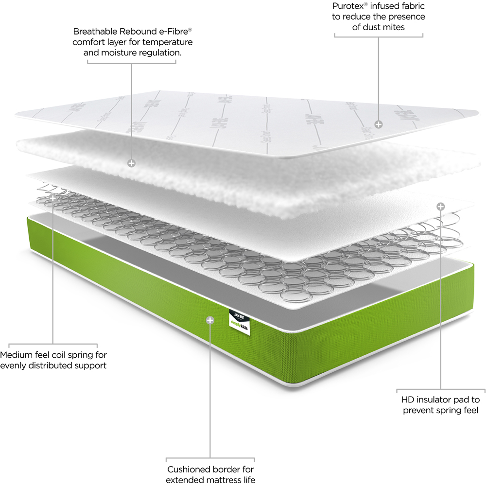 This single sprung mattress offers a medium-firm feel, perfect for children. Its deep comfort layers and supportive spring system provide a cosy sleep environment. The Purotex anti-allergy technology actively works to create a cleaner, healthier sleeping space. Made with 100% foam-free construction and eco-friendly materials, it',s free from harmful VOC emissions. A high-density eco-insulator and a layer of rebound e-fibre add extra comfort and support. For lasting comfort, regular rotation is recommended. The mattress includes a five-year guarantee and is manufactured in the UK to British and European safety standards.