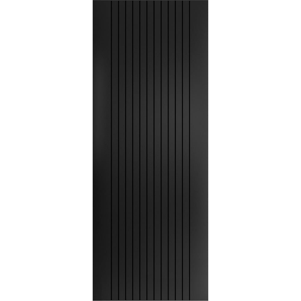 Elevate your interior with the Aria Black Glazed Laminated Internal Door. This stylish door boasts a contemporary fluted design, featuring a black laminate with a subtle stippled texture and sleek black grooves. Its semi-solid core construction ensures quality and durability, making it a perfect choice for any room in your home. Ready to install, this versatile door offers a touch of elegance that complements a range of interior styles. Dimensions are 1981 x 686 x 3.5mm. Please note: Individual panes are indelibly marked to comply with building regulations. While discreet, these markings are visible to meet compliance requirements. The number of vertical grooves may vary depending on door width.
