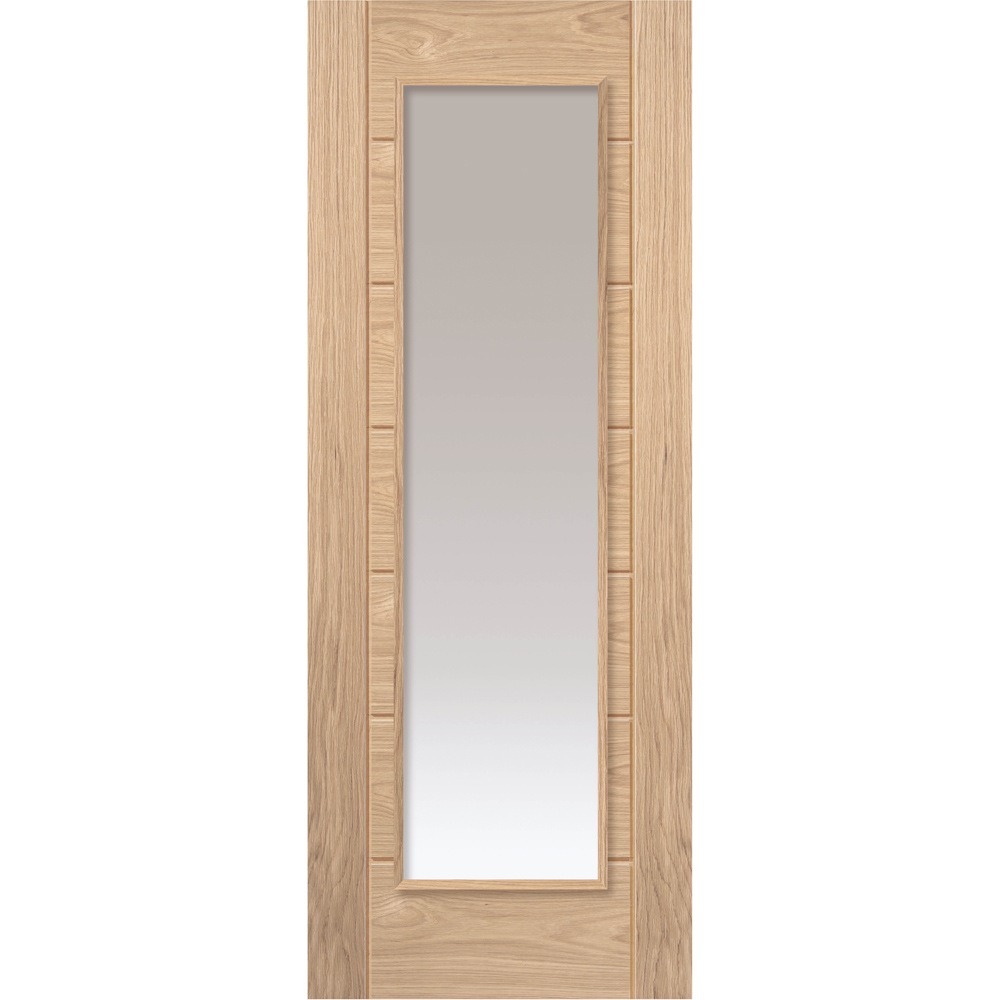 The Palomino Contemporary Oak Internal Door brings a touch of modern sophistication to any interior. Its striking design features a grooved central panel complemented by seven ladder-style panels with square, real wood grooves. The clear safety glass, detailed with raised beading, adds a touch of elegance. Offered unfinished, with pre-finished options available upon request. This versatile door, measuring 1981 x 686 x 3.5mm, is perfect for a variety of rooms and styles, offering a high-end finish whether you're renovating or building anew.