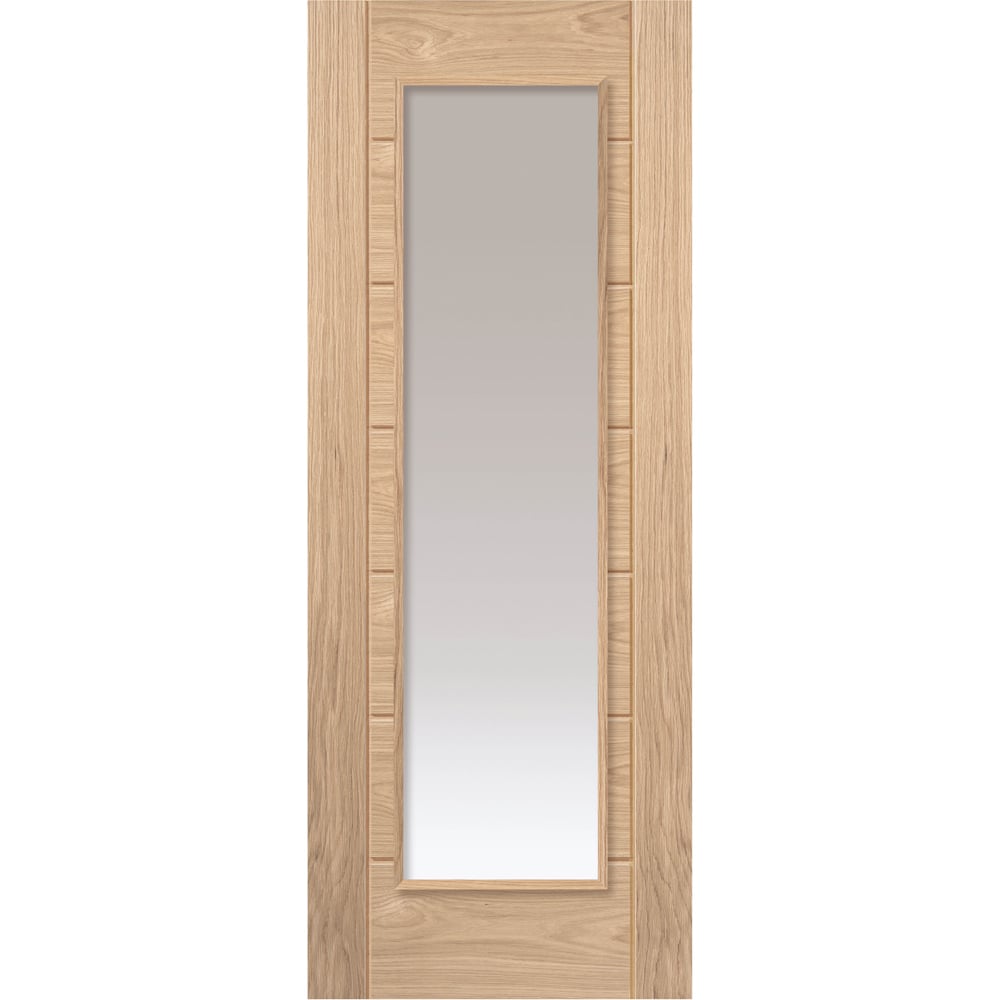 The Palomino Contemporary Oak Internal Door brings a touch of modern style to any interior. Its striking design features a grooved central panel complemented by seven ladder-style panels with square, real wood grooves. The clear safety glass, detailed with raised beading, adds a sophisticated touch. Offered unfinished, this door allows for complete customization, with pre-finished options available upon request. Measuring 1981 x 838 x 3.5mm, it's a versatile choice for a variety of rooms, offering both quality and a clean aesthetic.