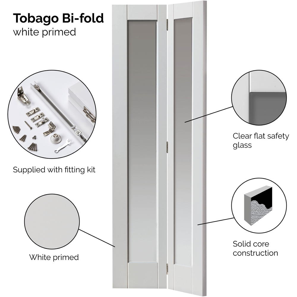 Enhance your home's style with the JB Kind Tobago Shaker White Glazed Bi-Fold Door (1981 x 762mm). This elegant door, inspired by Shaker design, features a full clear glass panel, giving a contemporary feel. Its primed glaze finish enhances its overall look. Ideal for internal use, this bi-fold door offers both style and practicality. This door is supplied primed.