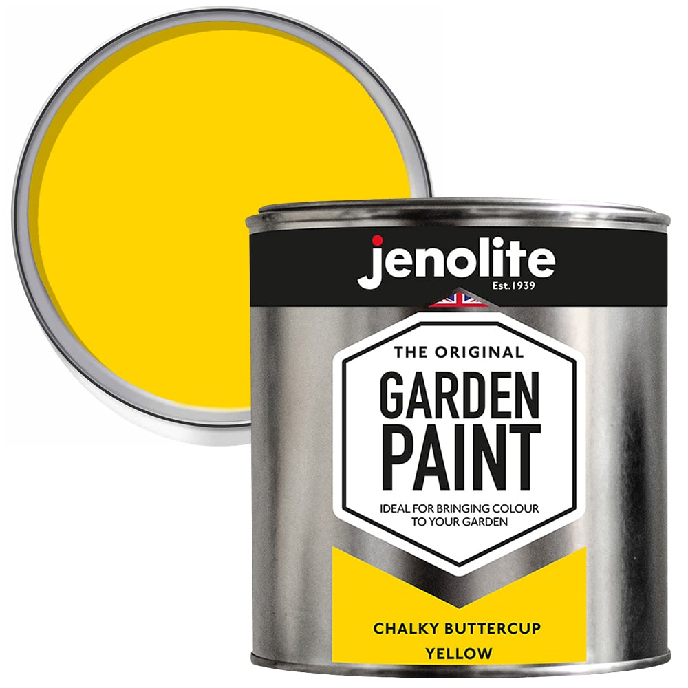 Jenolite Original Buttercup Yellow Garden Paint. Direct application to metal, wood, plastic, ceramic, and concrete. Provides a high-quality chalky finish. Weather and UV resistant for lasting results. Ideal for garden furniture, plant pots, and ornaments.