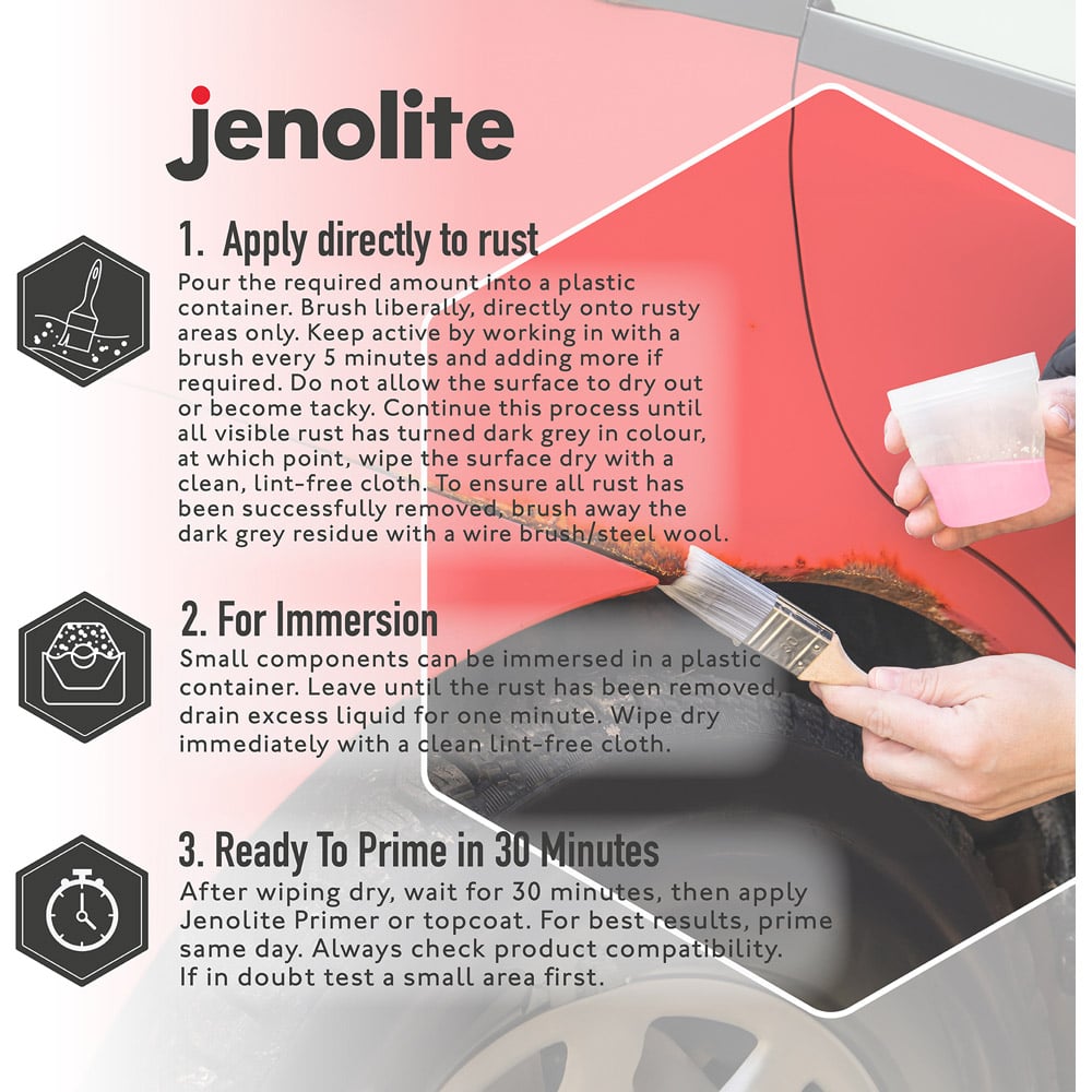 Conquer rust quickly and effectively with Jenolite Original Rust Remover Thick Liquid. This fast-acting, one-litre, non-drip formula chemically destroys rust, leaving a bare metal finish. Its non-drip design prevents waste and ensures precise application, even on uneven surfaces. The resulting residue is easily wiped or washed away. Tackle rust on car bodywork, bikes, vehicle chassis, wheel arches, tools, boats, machinery, gates, garden furniture, BBQs—and much more.