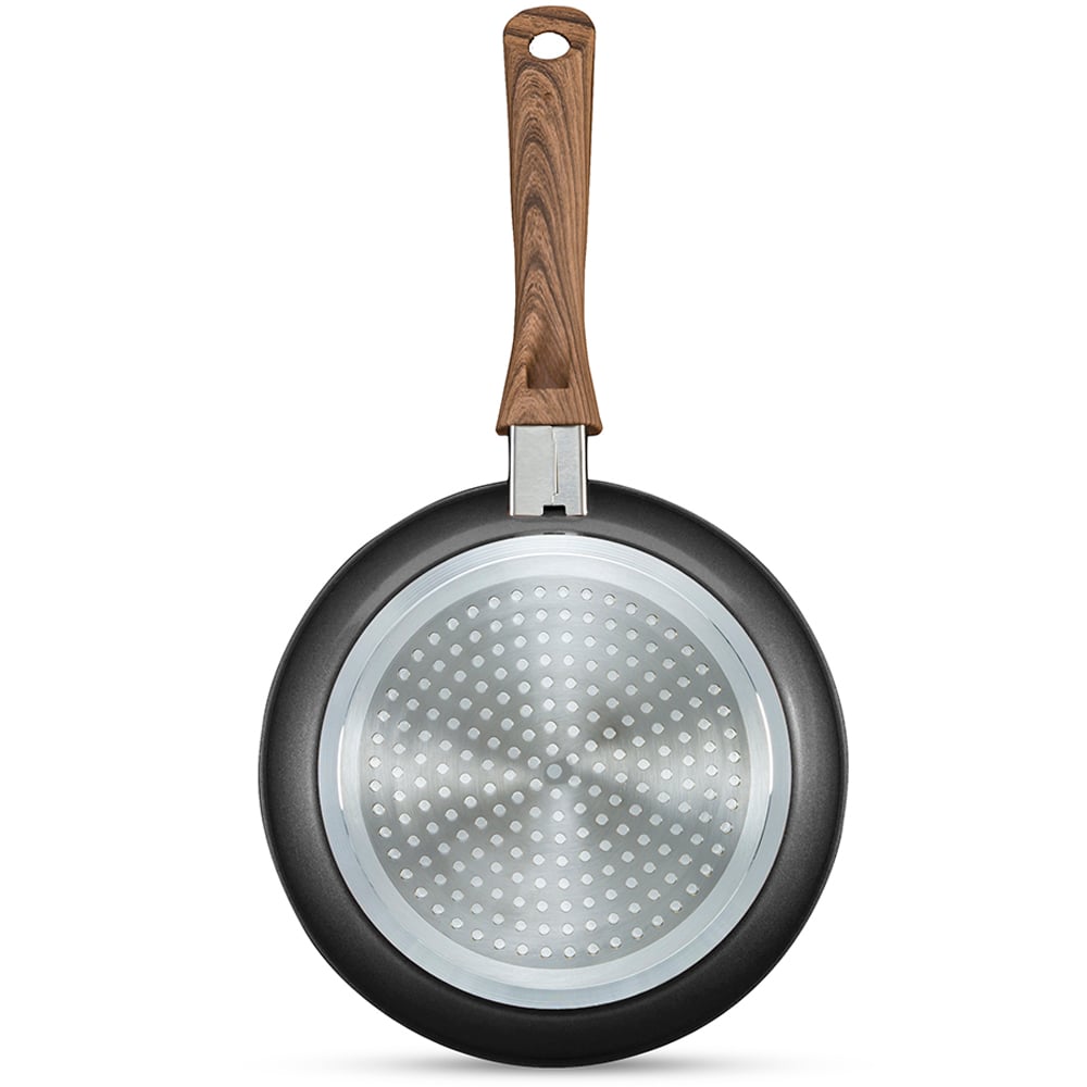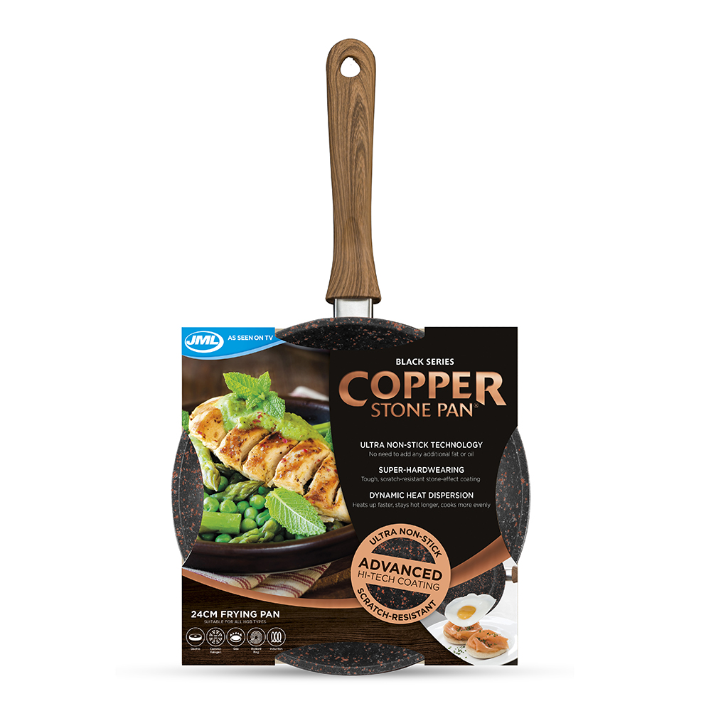 Elevate your kitchen with the 24cm Black Copper Stone Pan. Its stylish black copper finish looks great whether it's on display or in use. This pan boasts cutting-edge non-stick technology for exceptional heat distribution, durability, and scratch resistance. Cook healthier meals with minimal or no oil, and enjoy easy cleanup. The rapid heating, even cooking, and long-lasting heat retention deliver a superior non-stick cooking experience. The beautiful colour toning and hand-sculpted wood-styled Bakelite handle add the perfect finishing touch.