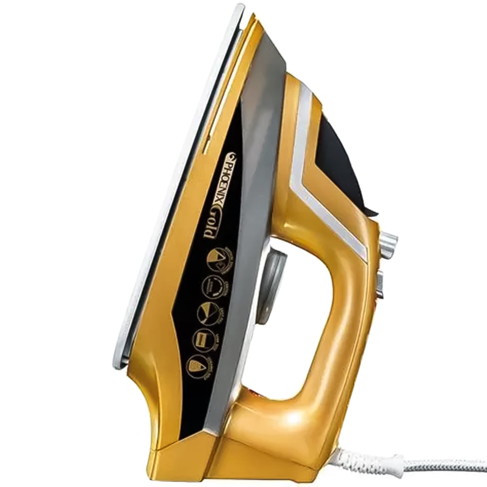 Effortlessly glide through your ironing with the Phoenix Gold Iron. This iron boasts a powerful built-in steam generator and a smooth ceramic soleplate for wrinkle-free results. Vertical steaming lets you refresh garments without an ironing board, and continuous steam ensures quick crease removal. Its contactless ironing feature protects zippers, embellishments, and prints, while the large 380ml water tank means fewer interruptions.