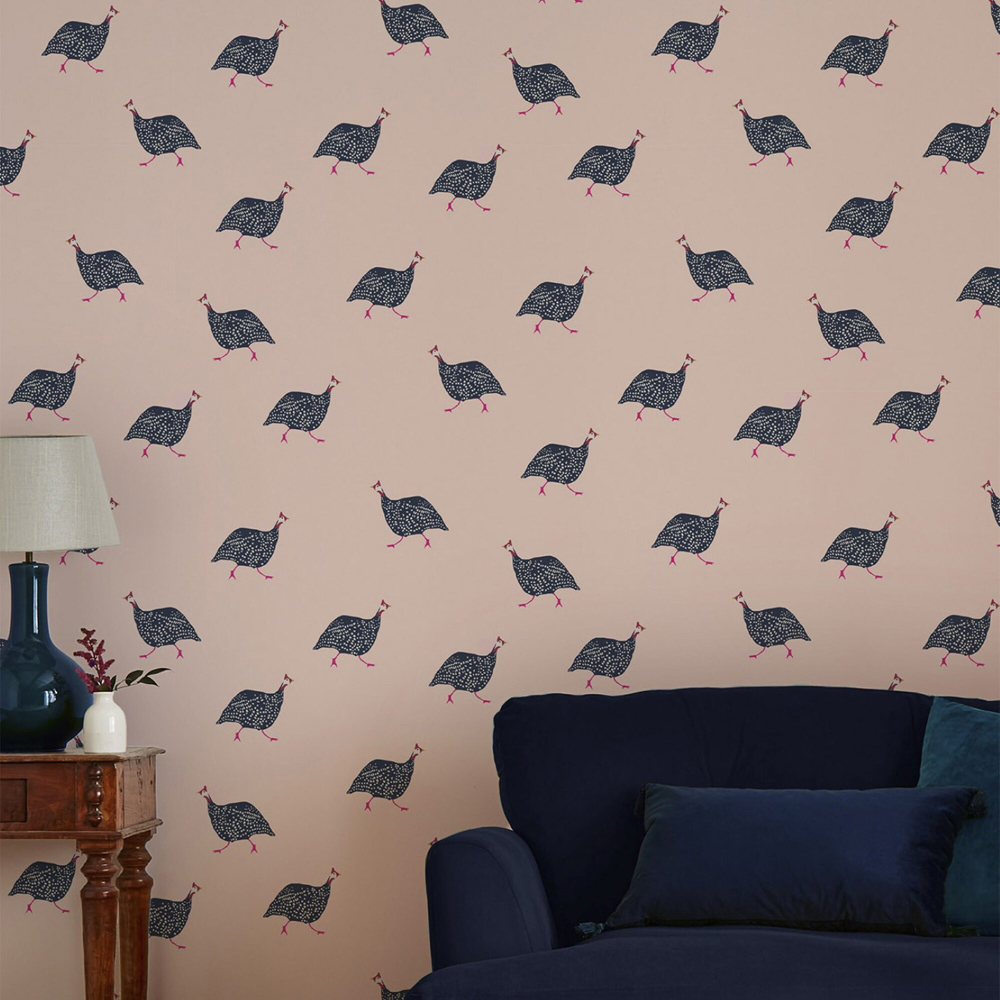 Inject playful charm into your home with this delightful guinea fowl wallpaper. A blush pink background provides a charming backdrop for the contrasting navy guinea fowl, each one a testament to hand-painted artistry and exquisite detail. The design boasts a large repeat, creating a striking visual impact, and is printed on a matt substrate for a sophisticated, contemporary finish. Furthermore, its paste-the-wall application ensures effortless installation.