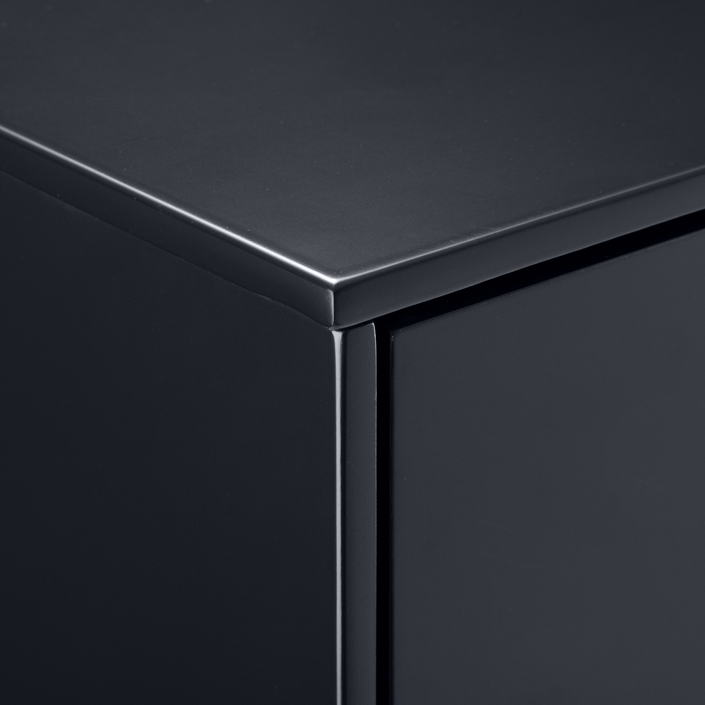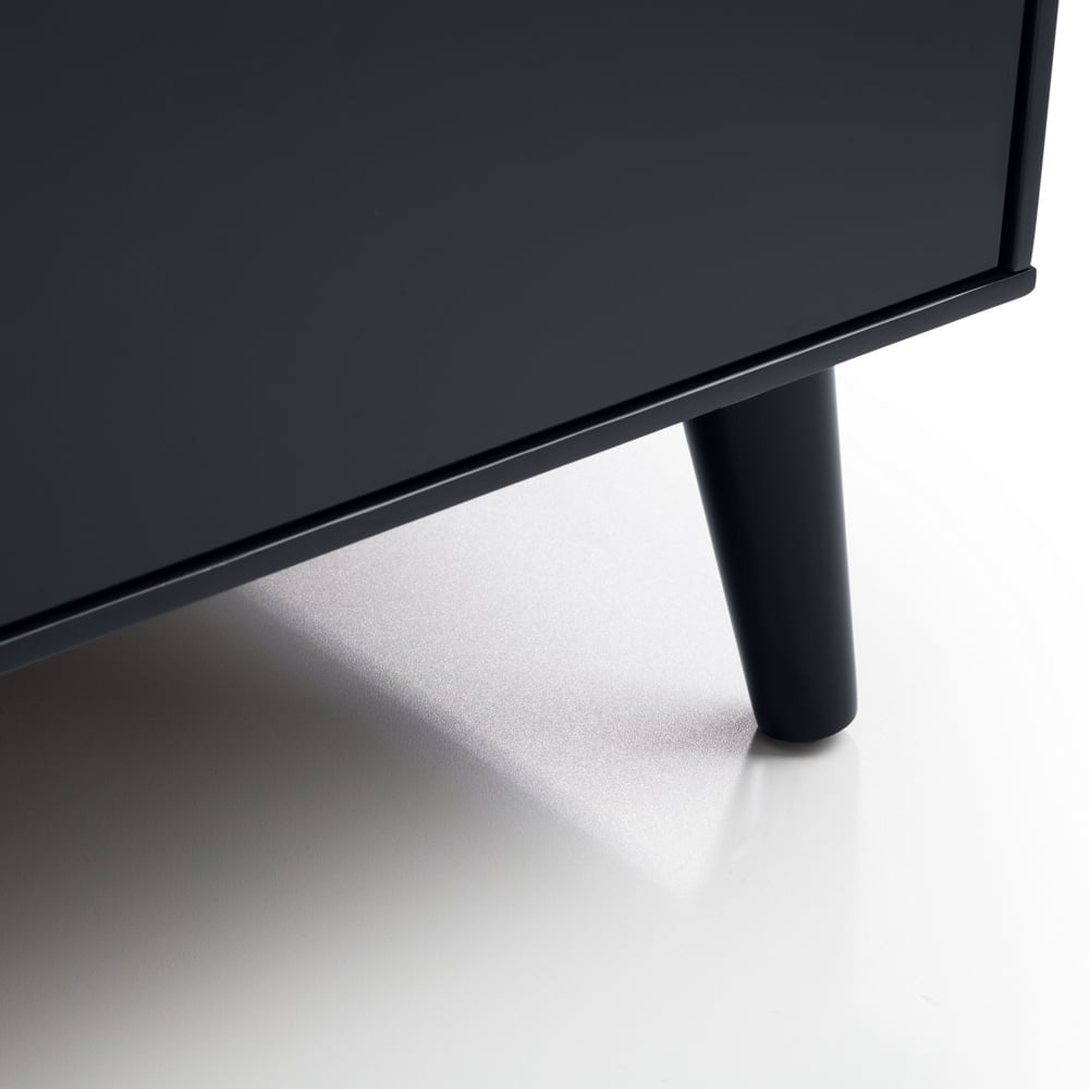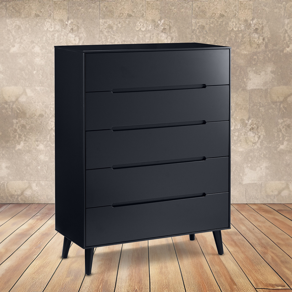 Elevate your home's aesthetic with the Alicia Drawer Storage Chest, a stylish blend of retro charm and modern functionality. Its smooth, matt-anthracite lacquered finish creates a flawless design, complemented by five soft-close drawers offering ample storage for your essentials. The retro-style pattern adds a touch of vintage appeal, while recessed handles and tapered feet deliver a subtle, classic look. This sturdy chest, with its sleek Scandinavian aesthetic, seamlessly integrates into any interior.