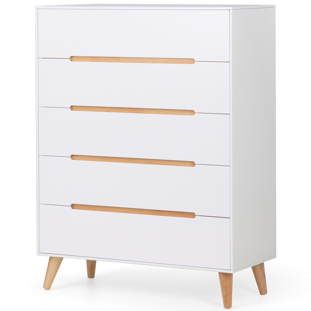 Add a touch of retro-chic to your home with the Alicia Drawer Storage Chest. This five-drawer chest boasts a smooth, matt-white lacquered finish and a retro-style patterned design suitable for various home-decor styles. Each drawer features soft-close functionality, offering decent storage space for your essentials. Finished with oak-finish recessed handles and tapered feet, the Alicia offers a classic, Scandinavian aesthetic that blends seamlessly into any space. Its sturdy construction ensures lasting quality and style.