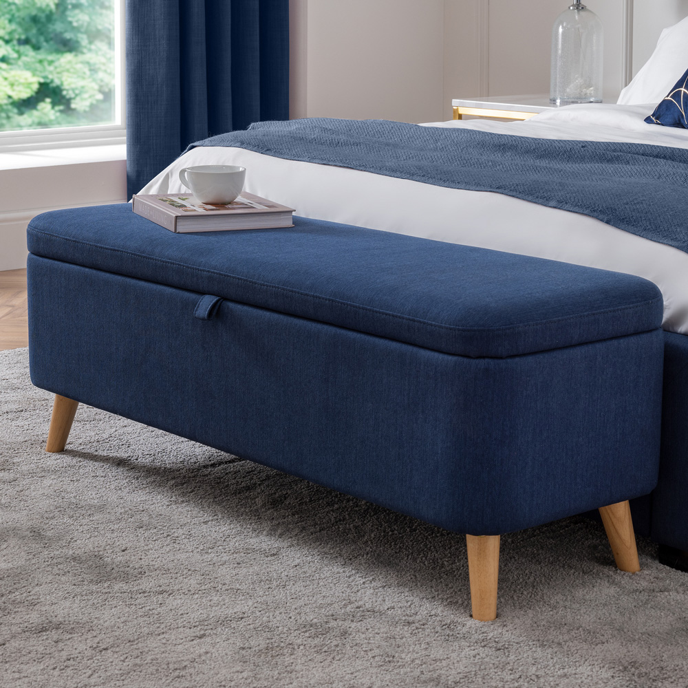 Elevate your bedroom with the Julian Bowen Astrid Blanket Box. This stylish storage solution boasts a classic Scandinavian and contemporary design. Upholstered in crisp linen fabric, its calming blue hue adds a touch of understated elegance. Perfect for storing cushions, linens, or duvets, the soft-close hinges ensure smooth and quiet operation. Finished with light oak splayed legs, the Astrid is a beautiful addition to any décor scheme, offering both practicality and charm.