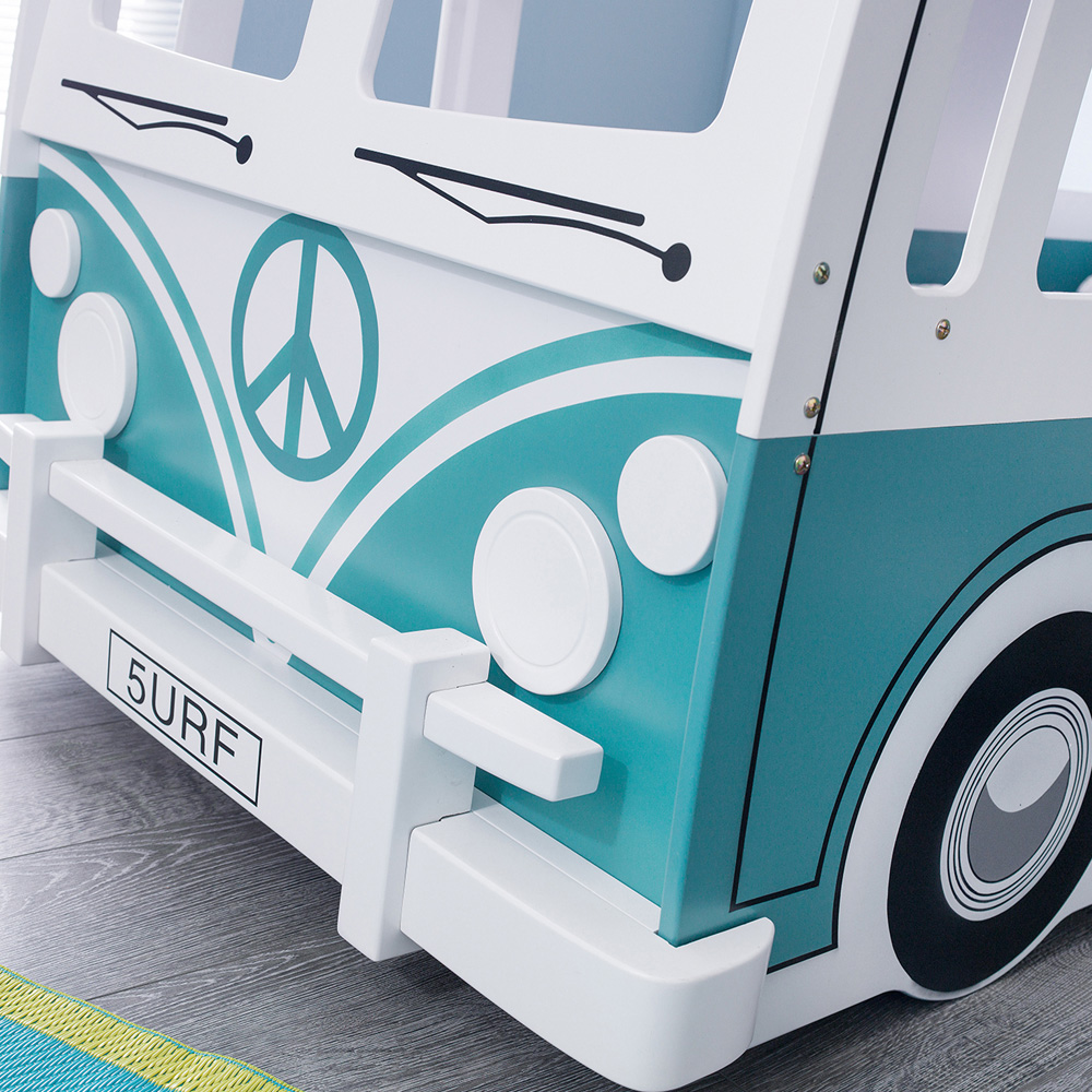 Introduce a playful and inventive touch to your children's bedroom with this Julian Bowen Campervan Bunk Bed. Boasting a robust construction, this bunk bed features a delightful campervan motif that children will adore. Complete with a surfboard-style ladder and a movable steering wheel, this bunk bed creates an enjoyable space where children can truly relish their time. Presented in a vibrant blue and white finish.