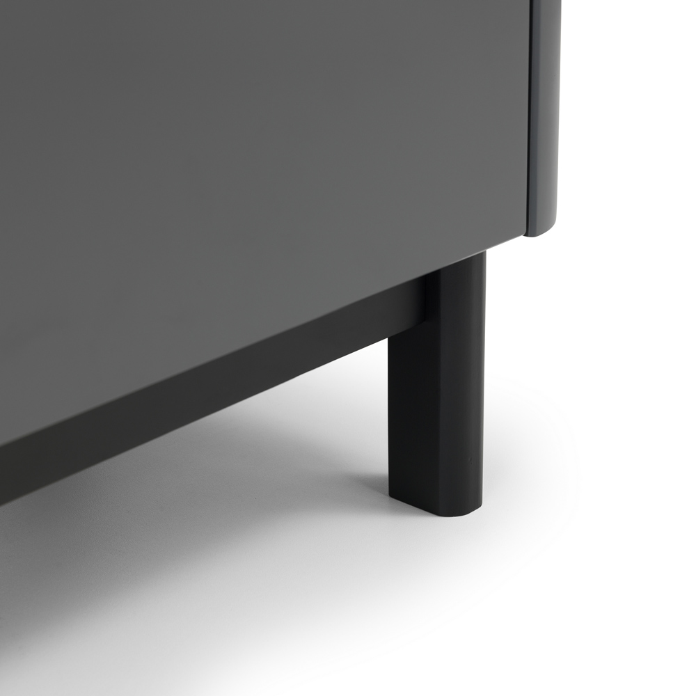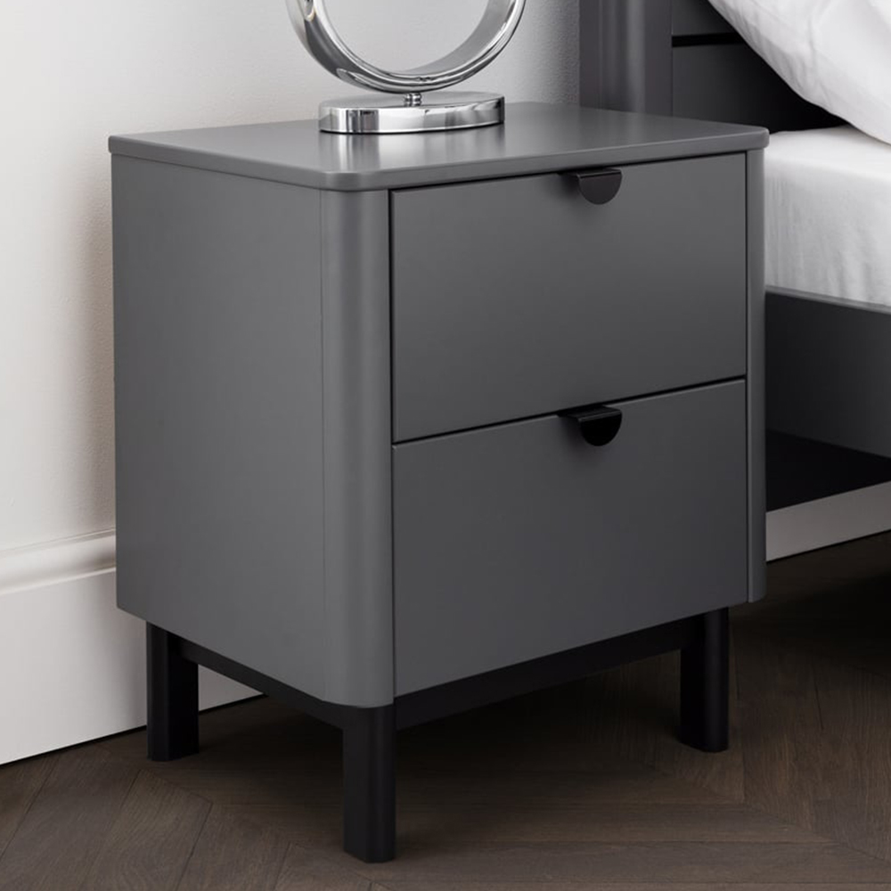 Upgrade your bedroom with the Chloe bedside table – a stylish addition to any space. This modern, retro-inspired piece boasts a sleek storm grey lacquer finish, complemented by satin black wooden legs and handles. The gently rounded corners add a touch of softness, perfectly blending form and function. Keep your night-time essentials close at hand within its two convenient drawers.