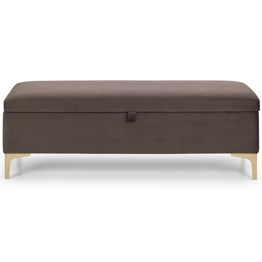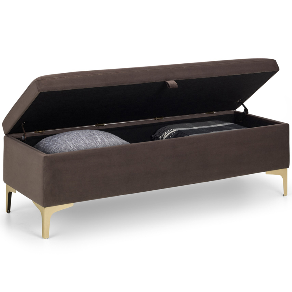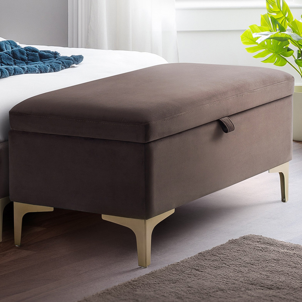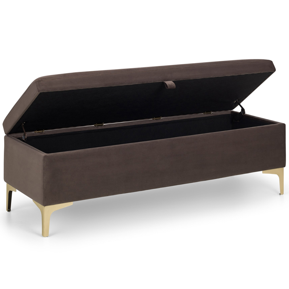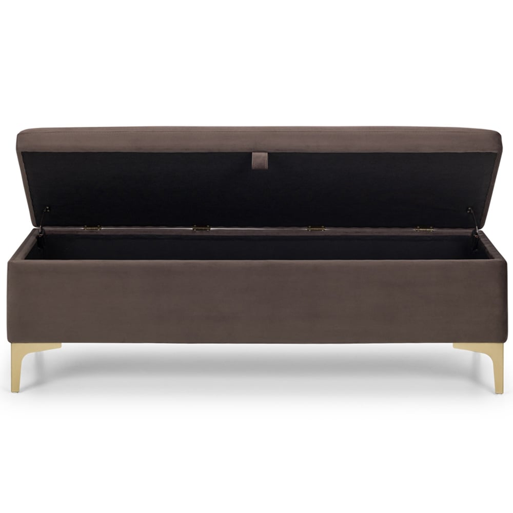 A stylish storage solution! This Deco blanket box complements the Julian Bowen Deco bed perfectly. Crafted from truffle velvet with elegant gold metal legs, its contemporary design offers timeless appeal. Ideal for storing cushions, linens, or duvets, it features soft-close hinges for effortless use.