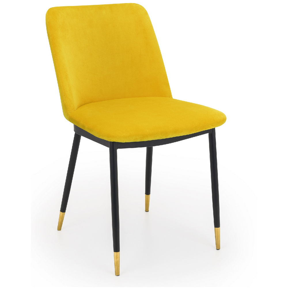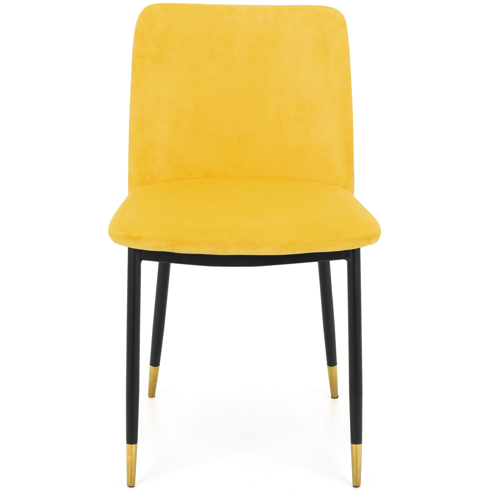 Elevate your dining area with the Delaunay dining chairs. These two matching chairs boast a sophisticated mustard velvet finish, complemented by sleek black legs and stylish brushed brass tips. Their simple, modern design effortlessly blends with any existing décor, creating a space perfect for intimate dinners or lively gatherings.