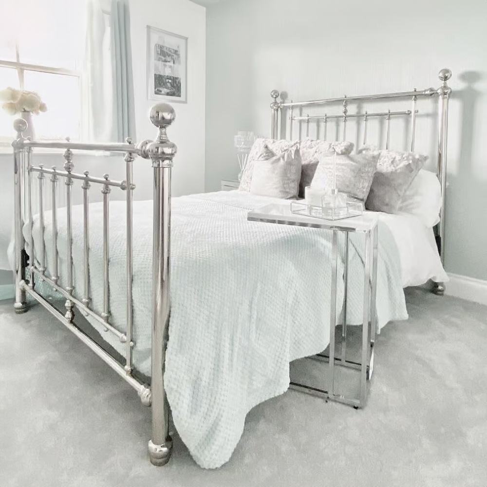 Indulge in luxury with the Empress King Size Chrome Bed Frame. This sophisticated bed boasts a sturdy chrome-plated frame, complete with a tall headboard and matching footboard, detailed with elegant finials. The sprung slatted base ensures your mattress stays comfortable and lasts longer.