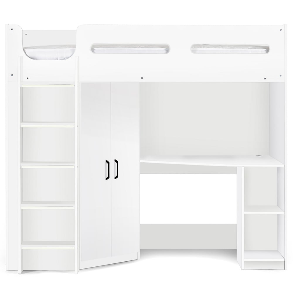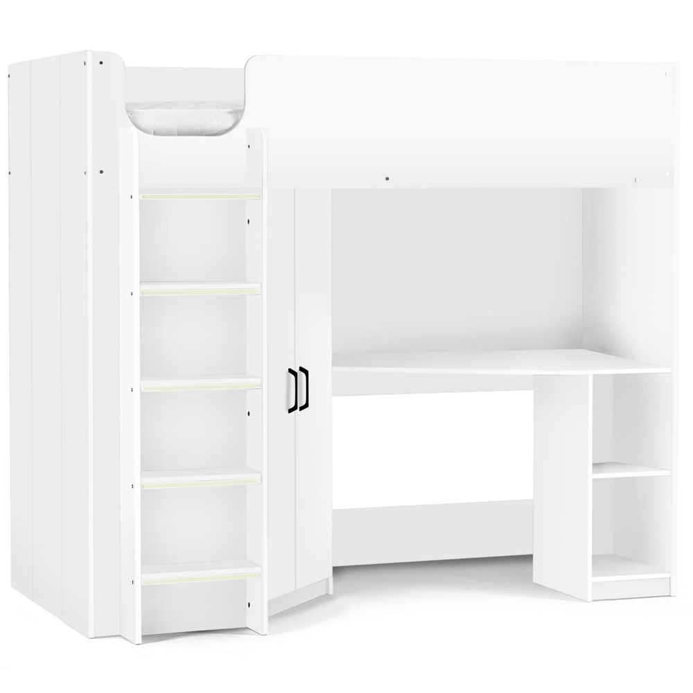 Introduce a touch of elegance and practicality to your child's bedroom with the Julian Bowen Hercules High Sleeper with Storage. This space-saving solution, finished in a crisp white, is perfect for both young children and teenagers. It boasts an integrated two-door wardrobe complete with a hanging rail, providing ample storage for clothes and accessories. A smooth desk surface with open shelving creates a compact and functional workspace. For added safety and peace of mind, the sturdy ladder features glow-in-the-dark steps, leading up to a comfortable bed for a restful night's sleep.