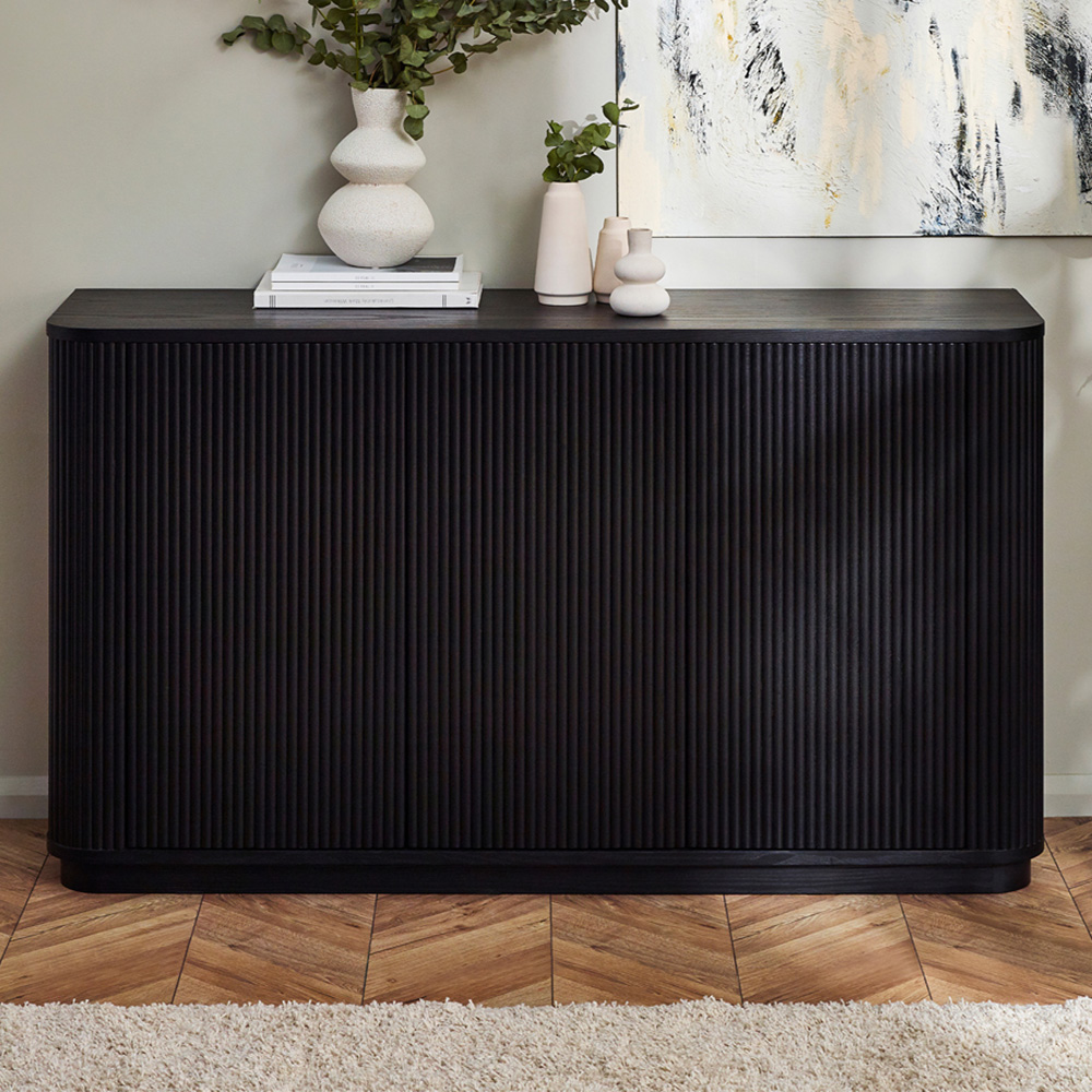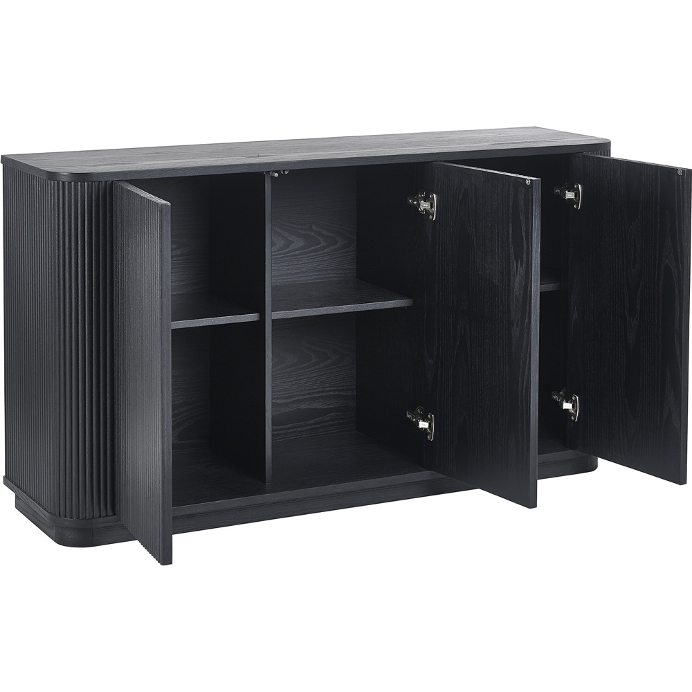 Upgrade your home',s aesthetic with the Julian Bowen Louis 3 Door Black Fluted Sideboard. Its sleek, matt black finish and intricate fluted and curved detailing add instant sophistication. Three push-to-open cupboards and ample shelving provide practical storage solutions, helping you effortlessly organise your belongings. Simple assembly is required.