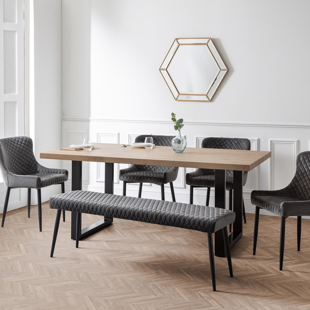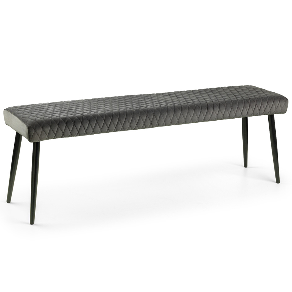 The Julian Bowen Grey Luxe Low Bench: Luxurious velvet upholstery with stunning quilted detailing and contemporary black-painted legs combine to create a stylish addition to your dining space. Also perfect as a striking hallway bench or statement piece in a dining area.