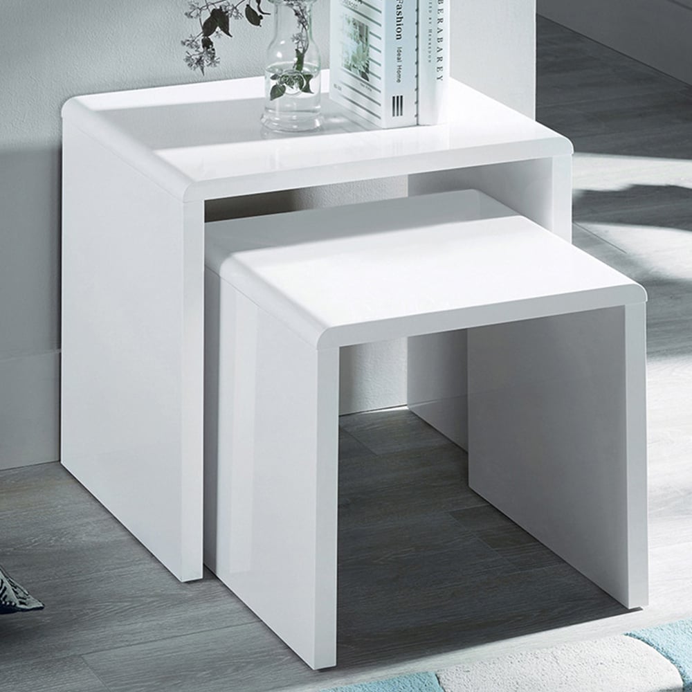 A stylish space-saving solution for your living room, this pair of nesting tables offers both beauty and practicality. Finished in a stunning high-gloss white lacquer, these tables create a clean, contemporary look that complements any décor. Crafted from MDF, the nested design provides versatility, allowing you to use one or both tables as needed. Perfect for smaller spaces, they're a chic addition to your home. Self-assembly required.