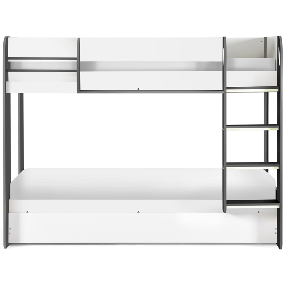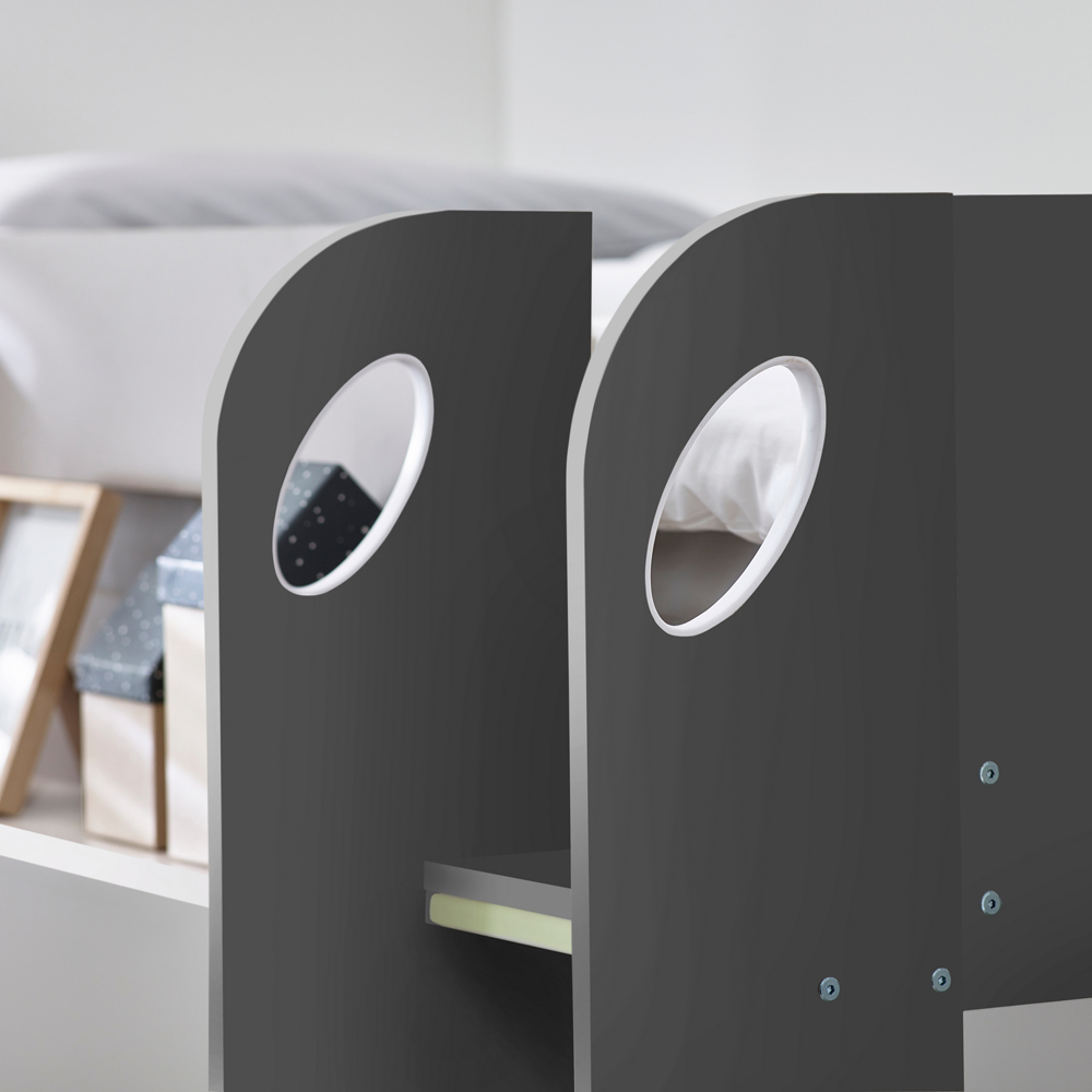 Introduce a charming and practical addition to your children's bedroom with the Julian Bowen Mars Bunk Bed with Underbed. Finished in a robust charcoal and white, this sturdy bunk is ideal for ensuring a restful night's sleep after an active daily routine. The lower bunk includes a cleverly designed pull-out trundle, offering a cosy nook for relaxation. Access to the upper bunk is made easy with a robust ladder featuring stylish cut-out handles with a sleek finish, while the integrated shelving provides space for bedtime books and favourite display items.