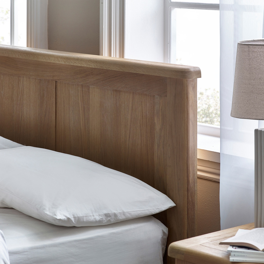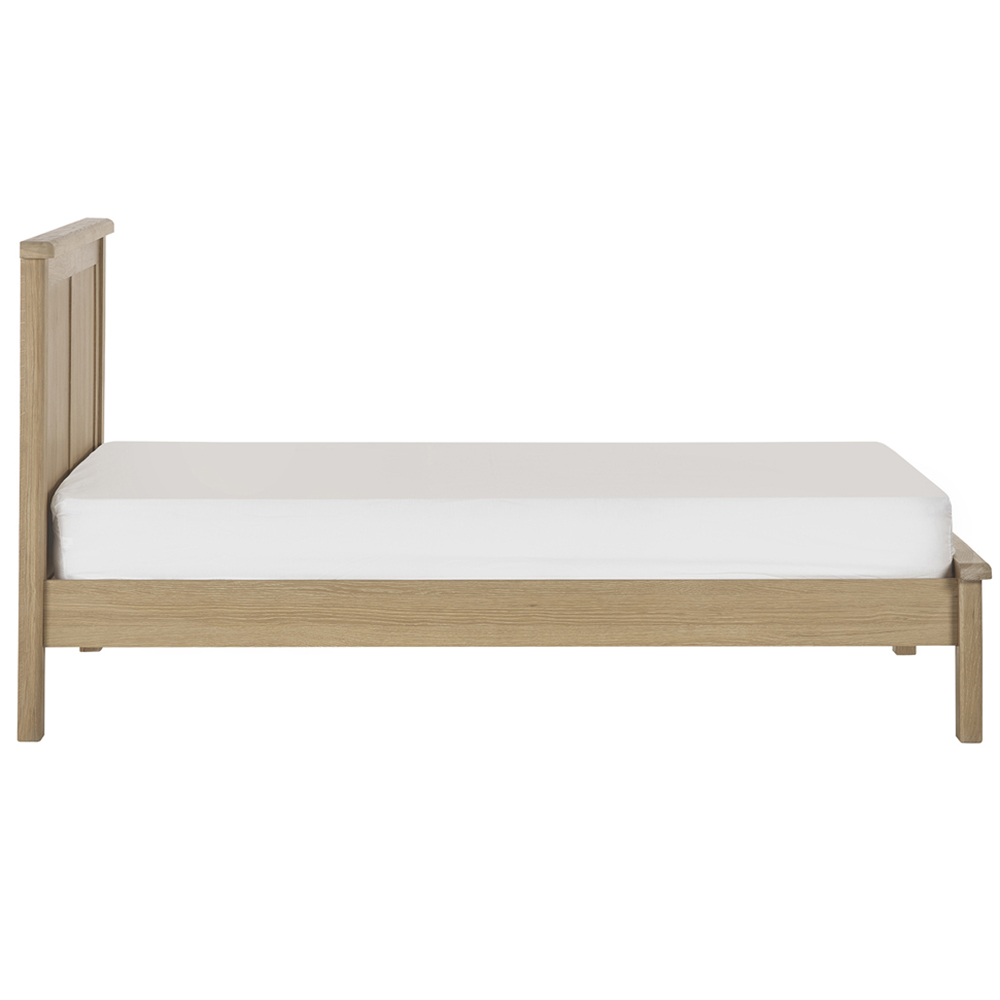 Enhance your bedroom with the Julian Bowen Memphis Double Limed Oak Bed. Its elegantly curved edges and panelled headboard bring a touch of classic style to any space. The sleek design incorporates a comfortable slatted base for optimal support. This bed complements other pieces in the Memphis range beautifully. Available in double (135cm) and king (150cm) sizes.