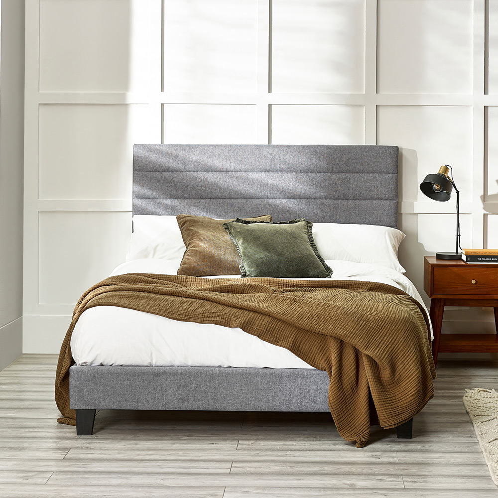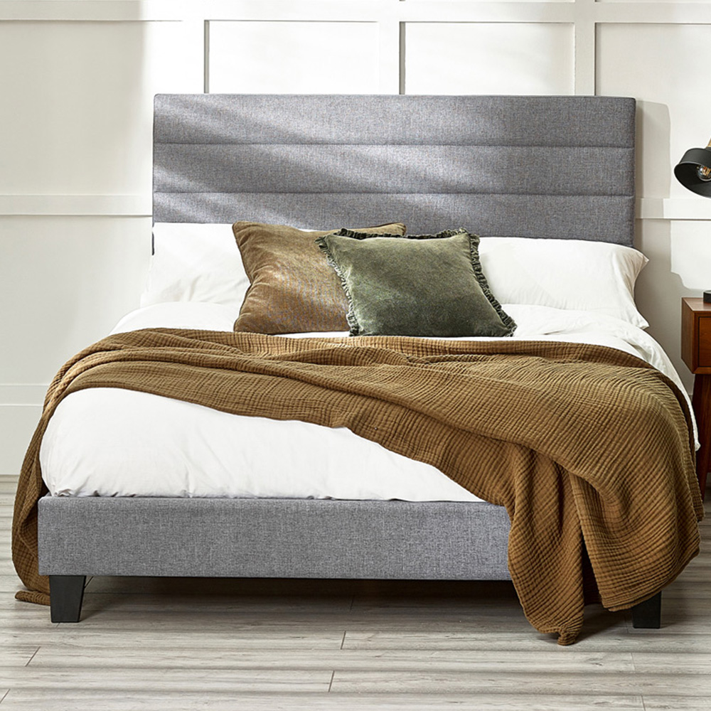 Transform your bedroom with the Merida double bed frame. Its exquisite grey linen headboard, elegantly finished with horizontal tufting, creates a sophisticated focal point. Crafted from solid materials, the Merida boasts a sturdy slatted base for exceptional support and lasting durability. This beautiful and practical addition will effortlessly enhance any décor.