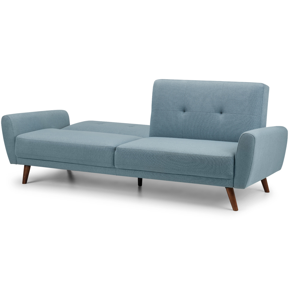 Upgrade your living space with the Julian Bowen Monza—a stylish double sofa bed in blue linen. Blending retro Scandinavian design with modern comfort, its generously deep seat offers a luxurious lounging experience. Effortlessly convert it into a spacious double bed, perfect for two adults, thanks to its cleverly designed split back.