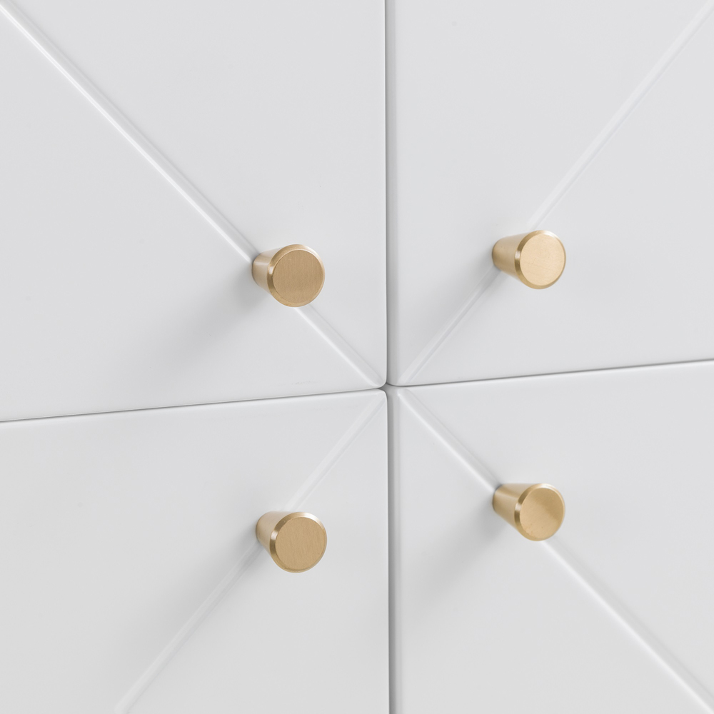 The Moritz 4-Door Cabinet offers a stylish storage solution for the modern home. Its striking linear design, featuring crisp white doors and sleek gold handles, creates a sophisticated aesthetic. The oak effect sides and feet provide a warm contrast, complementing contemporary decor. Ample storage space is cleverly concealed behind the four doors, making this cabinet both practical and visually appealing.