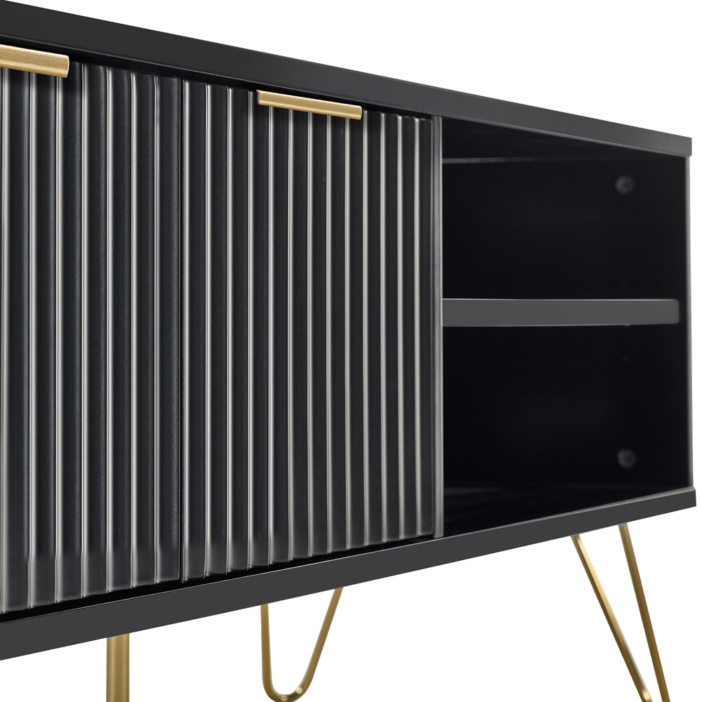 Elevate your living space with the Murano Matt Black TV Unit. Its brushed gold accents add a touch of high-end style, perfectly complementing a range of interior designs. The sleek matt black finish allows for effortless coordination with existing furniture. Two doors conceal shelving, providing a stylish storage solution to keep your space clutter-free.