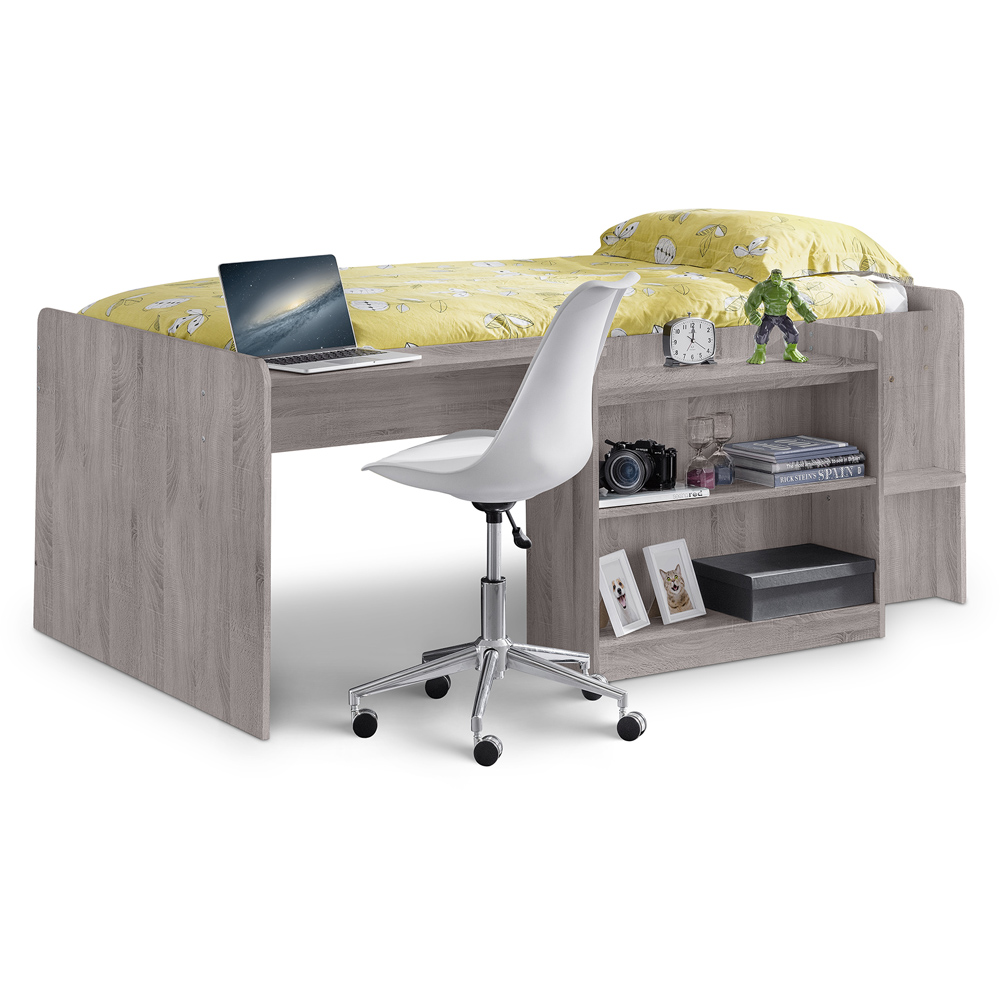 Give your child',s bedroom a stylish refresh with the Neptune Grey Oak Midsleeper. This space-saving design boasts a clean, minimalist aesthetic in a fresh white finish, perfect for modern children',s rooms. The mid-sleeper cleverly incorporates a desk with two generous shelves, plus handy under-bed storage – freeing up valuable floor space for toys and books. Built from robust particleboard with a foil finish, it features a wooden slatted base for a comfortable sleep and accommodates a UK single mattress. Please note: Mattress and chair shown are for illustrative purposes only.