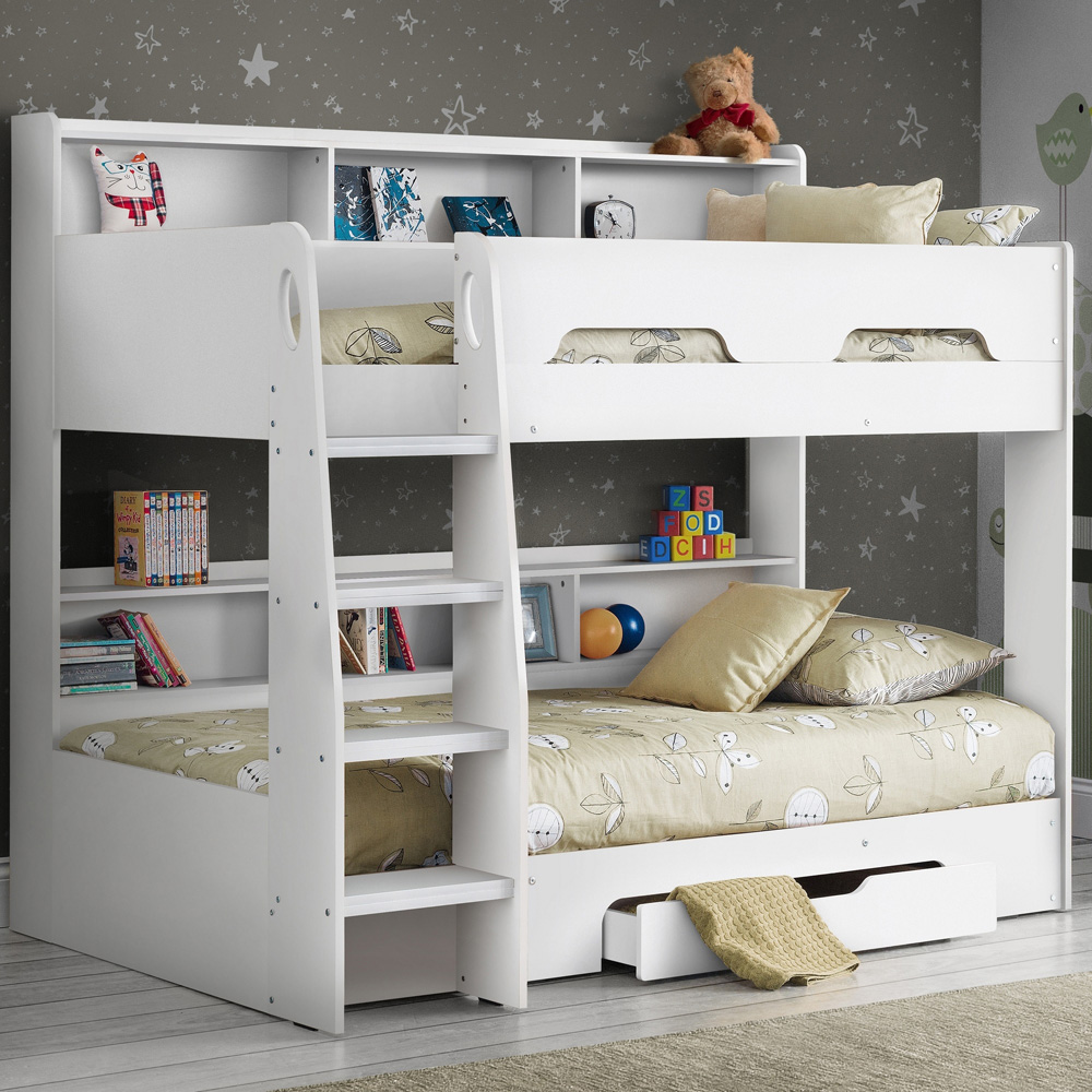 Create a snug and inviting atmosphere in your child's bedroom with the Julian Bowen Orion Grey Oak Single Drawer Bunk Bed. Thoughtfully designed, this robust bed is ideal for children, providing a restful night's sleep after a busy day of activities. It boasts a practical pull-out drawer and extensive shelving for their books and toys, complete with a subtle raised lip to keep everything secure. The lower bunk sits closer to the floor, making it perfect for smaller children. For added safety, the sturdy ladder includes attractive cut-out handles, with optional glow-in-the-dark strips on the steps. Please note that due to bunk bed safety regulations, only standard-size mattresses are suitable for use on the upper bunk.
