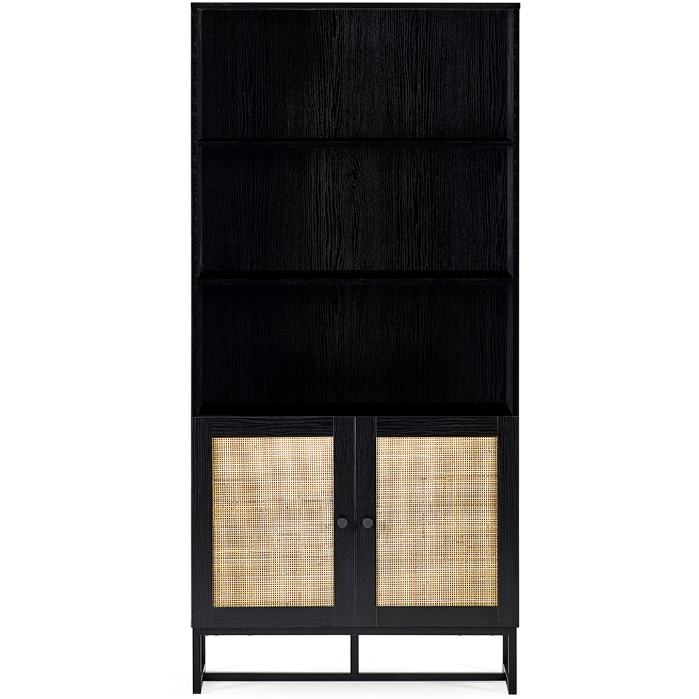 Elevate your home's style with the Padstow 2-Door Black Tall Bookcase. This exquisite piece blends modern construction with retro design elements, creating a warm and chic aesthetic. Featuring natural rattan fronts and an industrial-style base, it offers the perfect blend of textures. Neatly organize your books and treasured memories behind two doors and across three shelves. A beautiful addition to any room.