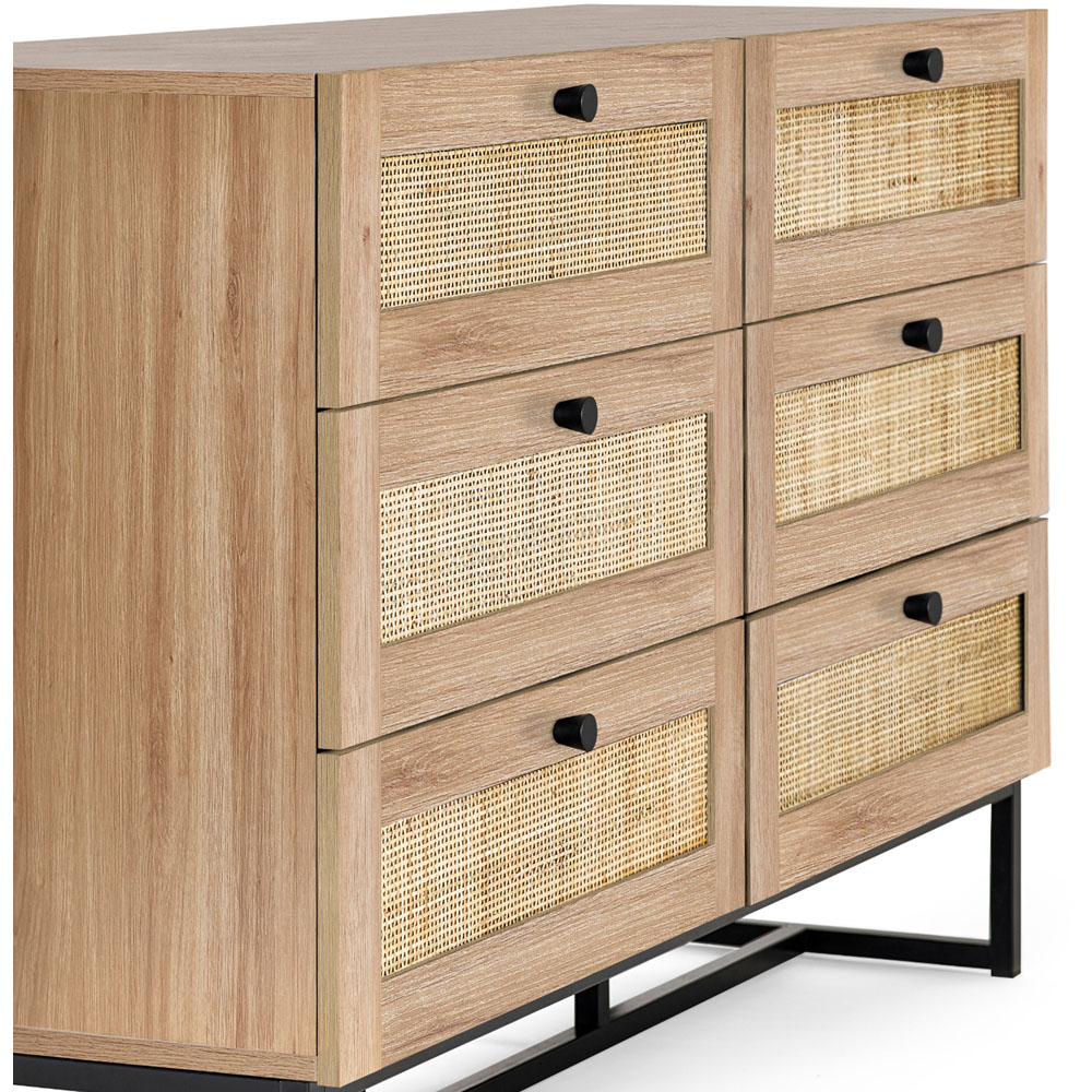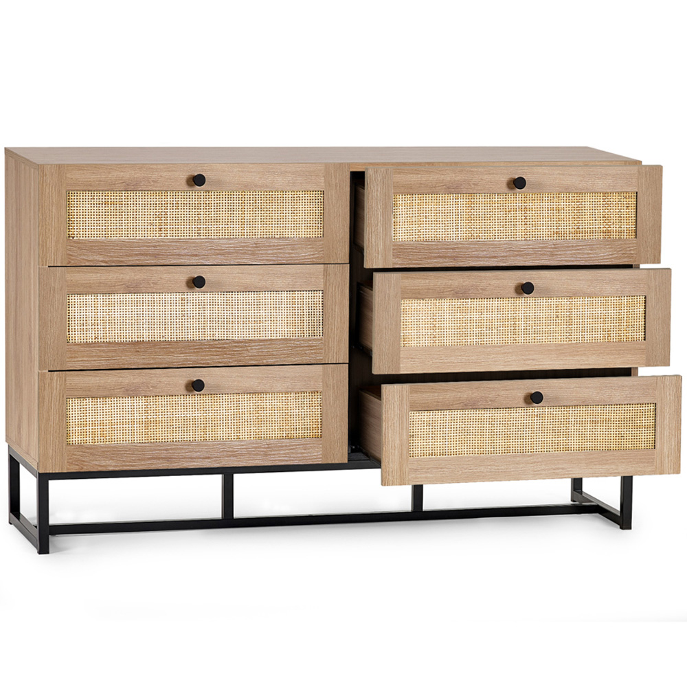 Enhance your home',s style and storage with the Padstow 6-Drawer Oak Storage Chest. This exquisite piece blends modern craftsmanship with retro charm, creating a warm and chic aesthetic. Natural rattan drawer fronts and an industrial-style base perfectly complement each other. Six generously sized drawers provide ample storage, while the spacious tabletop offers a perfect display area for cherished items, ideal for displaying favourite memories, faux plant pots, trinket dishes and more.
