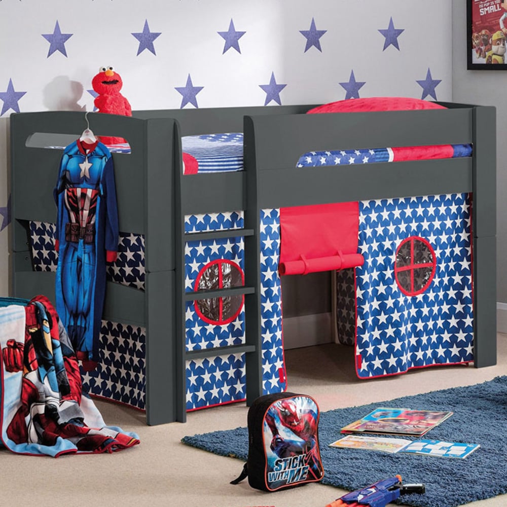Transform your child's bedroom into a captivating haven with the Julian Bowen Pluto Anthracite Mid Sleeper, complete with a Blue Star Tent. Finished in a sleek, smooth stone anthracite lacquer, this sturdy and stylish mid-sleeper boasts a contemporary design with fantastic functionality. Featuring a robust ladder that can be assembled on either the left or right, the Pluto can also be converted into a single bed as your child grows. Paired with the Pluto Star Tent, this bed creates a fun and vibrant play space, perfect for sparking your child's imagination and providing hours of fun.