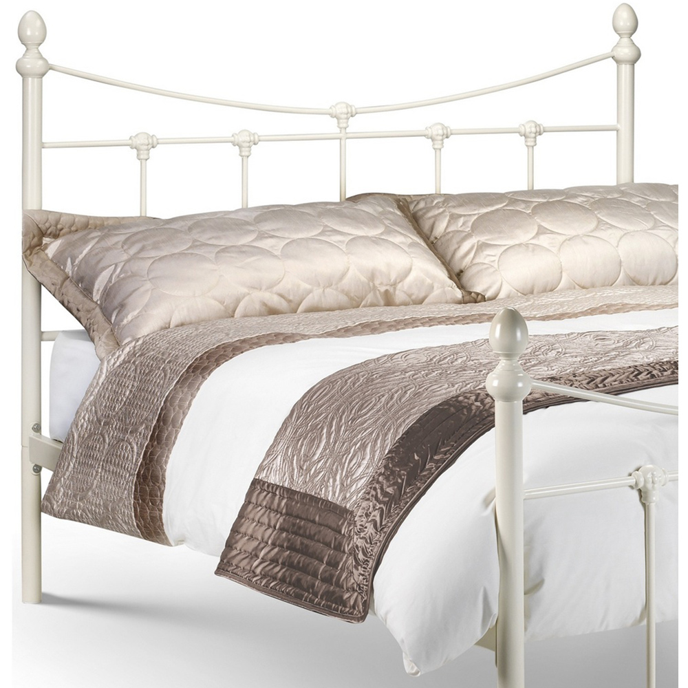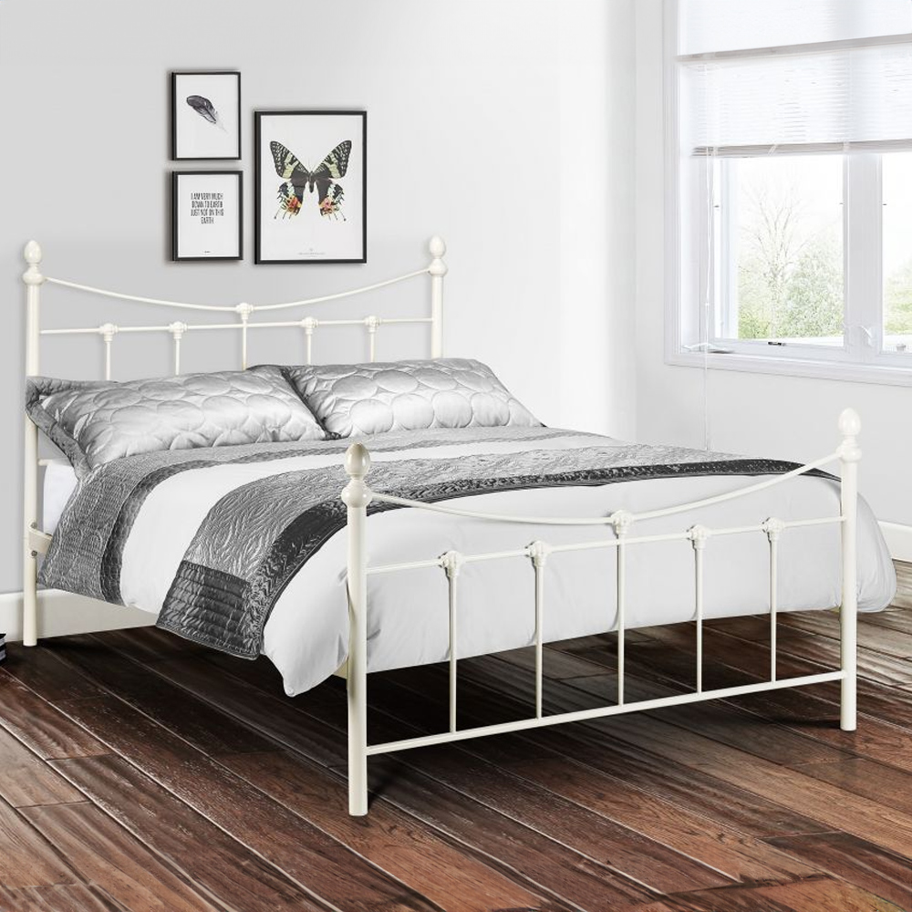 Introducing the Rebecca single bed. This elegant metal bed frame boasts a timeless design in a sophisticated stone white finish, perfect for elevating any bedroom, from contemporary to traditional. Its robust steel frame ensures lasting durability, while the sprung slatted base provides superior comfort and extends the life of your mattress. Experience both style and substance with this beautifully crafted piece.